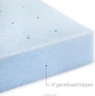 Memory Foam PLUSH MEMORY FOAM FEEL: Add 4 inches of thick, plush gel memory foam to your bed to create a soft and conforming feel that cradles your body while you sleep COOLING GEL INFUSION: Contouring memory foam is infused with gel material that captures and dissipates heat for a cooler memory foam experience DESIGNED FOR BREATHABILITY: This thick topper provides maximum comfort and softness without sacrificing breathability. A ventilated design improves airflow so you can sleep cool and comfortable ELEVATED PRESSURE POINT RELIEF: Upgrade your old mattress with this memory foam topper that distributes weight evenly and conforms to your curves for targeted pressure point relief SHIPS IN A BOX: Rolled and shipped in a box, this topper meets the highest safety standards; just open it and give it 24-48 hours to decompress and shed the new foam scent; 3-year warranty The LUCID 4 Inch Gel Memory Foam Mattress Topper adds new life to and enhances the comfort of an existing mattress. LUCID's thickest mattress topper, this ultra thick comfort layer is made of plush, gel-infused memory foam for supreme comfort. LUCID memory foam compresses evenly beneath the unique weight and shape of a body, conforming to curves to relieve pressure at the shoulders and hips. Top quality foam is infused with advanced gel material that captures and distributes heat for a more comfortable sleep temperature. Mattress topper has a ventilated design that improves breathability for refreshing sleep.