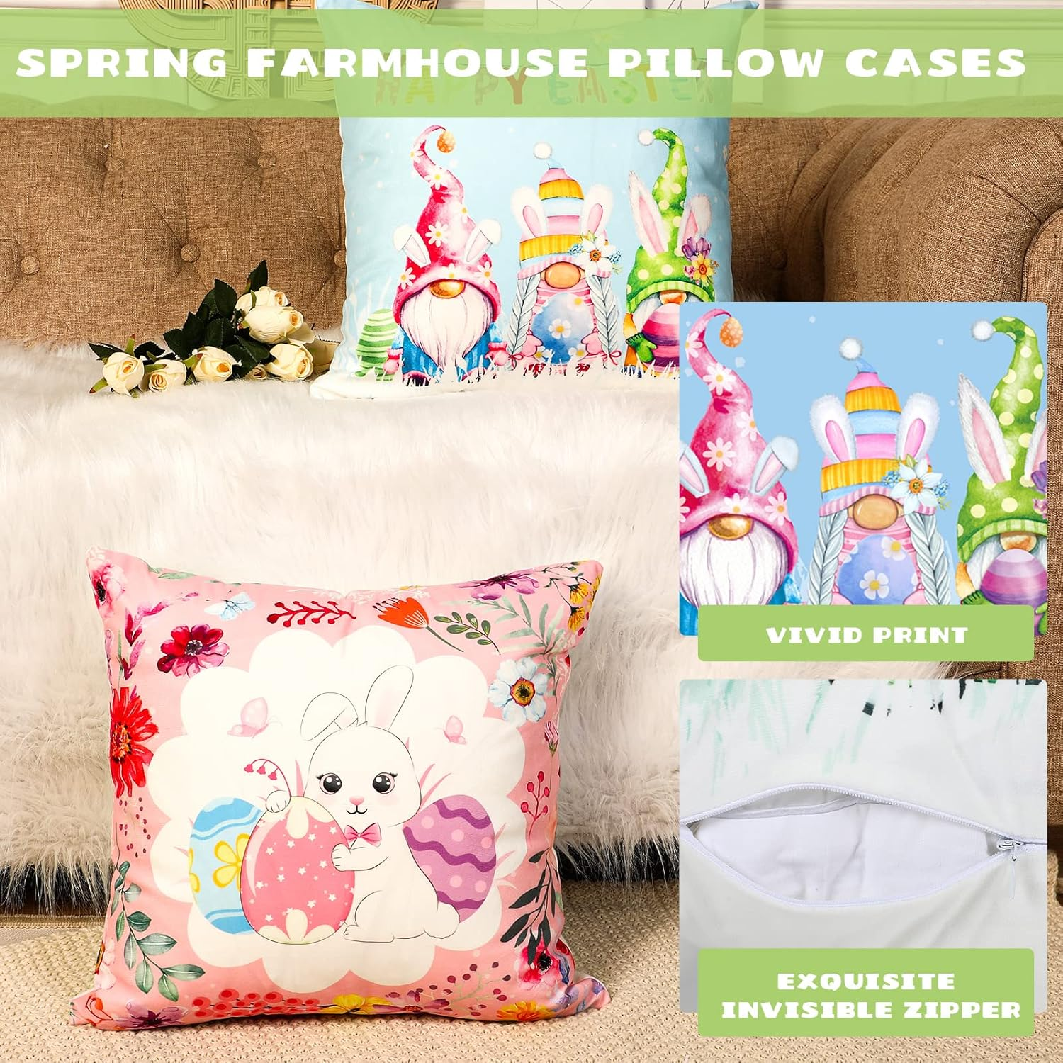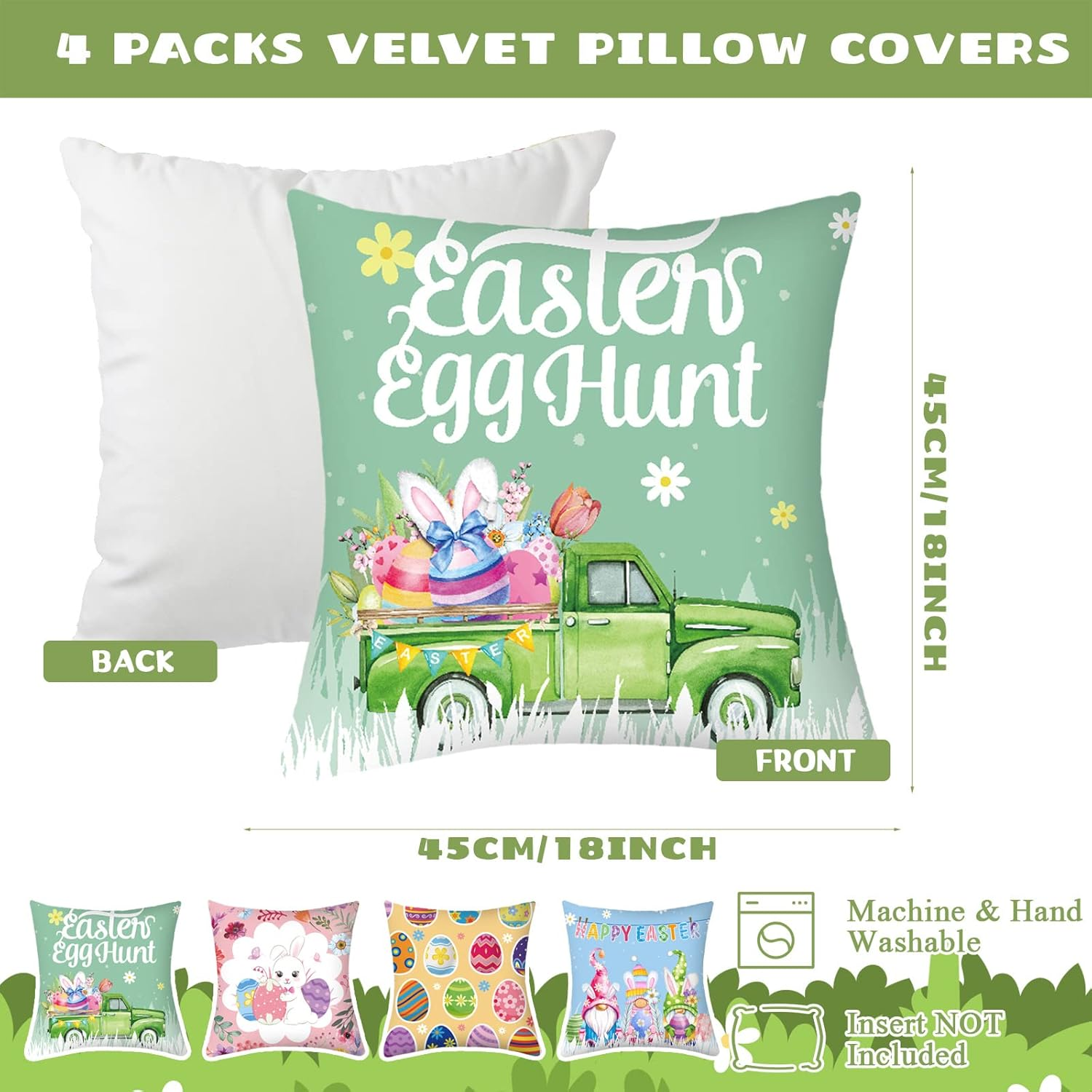 Store New Arrivals Add to Favorite View Feedback Contact GiftByRebecca has been in the US market for over 2 years and offers free delivery to the customer's home with professional customer service 4 Pcs Easter Pillow Covers 18 X 18 Inch Colorful Easter Throw Pillow Cases Decorations Easter Bunny Pillow Covers Egg Gnome Pillow Cushion Case Spring Decor Farmhouse Decorative for Sofa Couch Bed Description 85% Velvet Delicate Spring Easter Design: the bunny pillow cover is printed with Easter elements, such as bunny, egg, flower, gnome and so on; Paired with the classic holiday pillow throw covers, which can enhance the spring feelings and add some colors to your home and party Velvet Material for You: the Easter bunny pillow case is mainly made of velvet, soft and comfortable to touch, breathable and lightweight, not fade or wrinkle easily, which can serve you for a long time Easter Pillowcases Set: the package comes with 4 pieces of spring pillow covers 18 x 18 inches in different patterns, enough quantity and fresh style will meet your different needs and replacements in your daily life; Note: pillow core is not included Exquisite and Thoughtful Designs: the size of these Easter throw pillow covers is about 18 x 18 inches/ 45 x 45 cm, the bottom is equipped with an invisible zipper, convenient for you to use; The zipper is not open to the entire bottom to make the overall shape beautiful; When using, gently fold the pillow core in half for easy installation Suitable for Multiple Occasions: each bunny decorative pillow cover is suitable for various places, such as your living room, bedroom, office, hotel, coffee shop, and so on; You can apply the covers to the pillows of bed, sofa, car, couch, seat (not included) to have a nice Easter decoration Features: Match with your room: These outdoor fabric pillow covers are printed with elegant and fresh patterns, vivid and bright, you can match them with your room, bedroom, car, living room easily, creating some joyful atmosphere. Make your room neat and lovely: The easter pillow cover is not only wrap your pillow to keep the pillow neat and tidy, the fresh appearance of the pattern also gives your pillow a nice decorative appearance. Specifications: Material: velvet Color: pink, green, blue, yellow mainly Size: about 18 x 18 inches/ 45 x 45 cm Package includes: 4 x Throw Pillows Covers Notes: Manual measurement, please allow slight errors on size. The color may exist a slight difference due to different screen displays. Pointed parts included, please keep away from little kids. Small items, please keep away from little kids to avoid swallowing. Item model number -Pillow -17 Style Classic Weave Type Pile Number of Items 4 Pattern Letter Print Country of Origin China Theme Flower,Holiday Cartoon Character Easter Bunny Number of Pieces 4 Unit Count 4.0 Count Room Type Living Room, Bedroom Batteries required No Product Dimensions 13.38"L x 11.02"W Material Velvet Shape Square Closure Type Zipper Item Weight 13.1 ounces Is Euro Pillow Size No Occasion Holiday,Party Special Feature Lightweight Color Bunny Pillow Type Throw Pillow Recommended Uses For Product Outdoors, Home Fabric Type 85% Velvet Product Care Instructions Machine Wash ABOUT US We offer the best prices around on high quality products. Our E-store includes media such as books, movies, music and games while offering electronics, toys, sporting apparel, clothing, tools, general home, garden items and more. SHIPPING We are always working hard to ensure your package arrives as soon as possible. Please understand that some factors like weather, high postal traffic, and the performance of shipping companies are outside of our control. We offer free shipping to the lower 48 states and ship within 2 business days of payment, usually sooner. We do not accept P.O. Boxes. Please provide a physical address. For shipping outside of the continental USA, we only use eBay's Global Shipping Program. The item is shipped to KY and then sent to the rest of the world. International customers are responsible for all duties and taxes. Continue to 'check out' to calculate costs for shipping the item to your country. Messages regarding eBay's Global Shipping Program MUST be directed at eBay EXCLUSIVELY. RETURNS We offer a 30-Day Return Policy on items in which you are not completely satisfied with. You have the option of a full-refund or an exchange of the item. No returns are available on items shipped outside of the USA PAYMENT We accept PayPal. CONTACT US This page content is yet to come Please ad us to your favorite seller and visit again later Thank You CUSTOMER SATISFACTION We try our very best to make sure every customer is completely satisfied. If there's a problem, message us! We're happy to help. WE ACCEPT