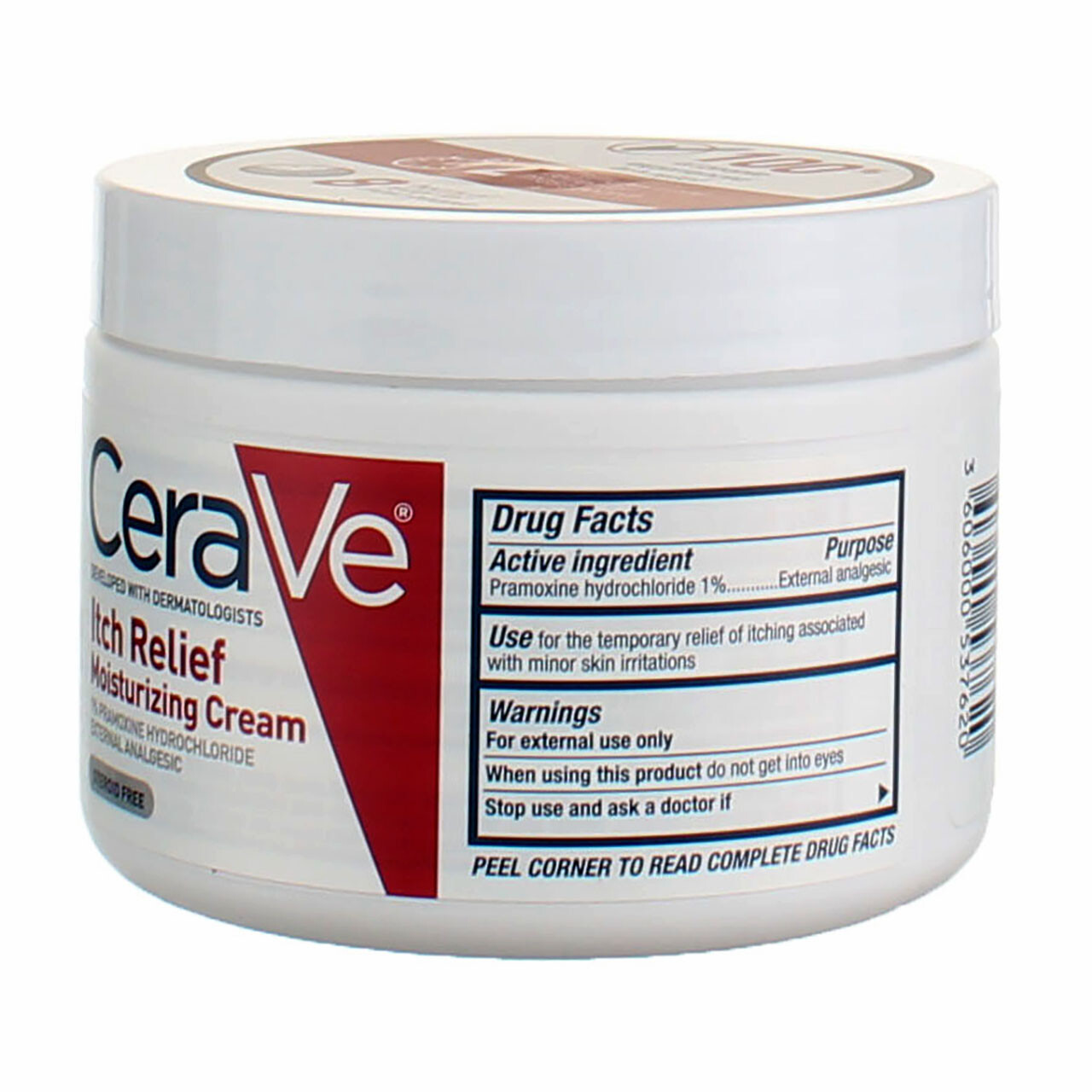 4 Pack CeraVe Moisturizing Itch Relief Cream, 12 oz Product Description Developed with dermatologists and formulated with the anti-itch ingredient, Pramoxine Hydrochloride 1%, CeraVe Itch Relief Moisturizing Cream for Dry Skin temporarily relieves itching associated with minor skin irritations, insect bites and sunburn. The product also contains three essential ceramides that helps repair and restore the skin's barrier all in an emollient based cream with a rich, velvety texture. With ceramides 1, 3 and 6-II Pramoxine Hydrochloride for itch relief Steroid-free Fragrance-free Non-comedogenic Sulfate-free Gentle, non-irritating formula Ingredients Inactive Ingredients PRAMOXINE HCL WATER GLYCERIN PETROLATUM CETYL ALCOHOL BUTYROSPERMUM PARKII (SHEA) BUTTER CETEARYL ALCOHOL PEG-100 STEARATE GLYCERYL STEARATE ISOPROPYL MYRISTATE STEARIC ACID DIMETHICONE PALMITIC ACID POTASSIUM PHOSPHATE CERAMIDE NP CERAMIDE AP CERAMIDE EOP CARBOMER BEHENTRIMONIUM METHOSULFATE SODIUM HYDROXIDE MYRISTIC ACID SODIUM LAUROYL LACTYLATE CHOLESTEROL TASMANNIA LANCEOLATA FRUIT EXTRACT PHENOXYETHANOL DIPOTASSIUM PHOSPHATE DISODIUM EDTA ALCOHOL DENAT. HYDROLYZED HYALURONIC ACID CITRIC ACID XANTHAN GUM PHYTOSPHINGOSINE ETHYLHEXYLGLYCERIN Ingredients Drug FactsActive IngredientsPurpose Pramoxine hydrochloride 1%External analgesicInactive Ingredients Water, glycerin, petrolatum, cetyl alcohol, butyrospermum parkii (shea) butter, cetearyl alcohol, peg-100 stearate, glyceryl stearate, isopropyl myristate, stearic acid, dimethicone, palmitic acid, potassium phosphate, ceramide np, ceramide ap, ceramide eop, carbomer, behentrimonium methosulfate, sodium hydroxide, myristic acid, sodium lauroyl lactylate, cholesterol, tasmannia lanceolata fruit extract, phenoxyethanol, dipotassium phosphate, disodium edta, alcohol denat., hydrolyzed hyaluronic acid, citric acid, xanthan gum, phytosphingosine, ethylhexylglycerin. Active Ingredients Pramoxine Hydrochloride Suggested Use Dosage Adults and children 2 years of age and older: Apply to affected area not more than 3 to 4 times daily.Children under 2 years of age: Consult a doctor. Instructions Adults And Children 2 Years Of Age And Older: Apply To Affected Area Not More Than 3 To 4 Times Daily. Children Under 2 Years Of Age: Consult A Doctor. Disclaimer The product descriptions and instructions provided by vitabox.com are for informational purposes only and are qualified in their entirety by the information available from manufacturers of the products. You should carefully read all product packaging, and contact the manufacturer with any questions before using a product. While we endeavor to ensure that product descriptions are current, manufacturers sometimes change their products. We are not liable for inaccuracies or misstatements about products. We do not provide medical advice or recommendations. You should not use the information provided by vitabox.com for diagnosing or treating a health problem or disease. If you have or suspect that you have a medical problem, immediately contact your health care provider. Information and statements regarding dietary supplements have not been evaluated by the Food and Drug Administration or any other government agency and are not intended to diagnose, treat, cure, or prevent any disease.