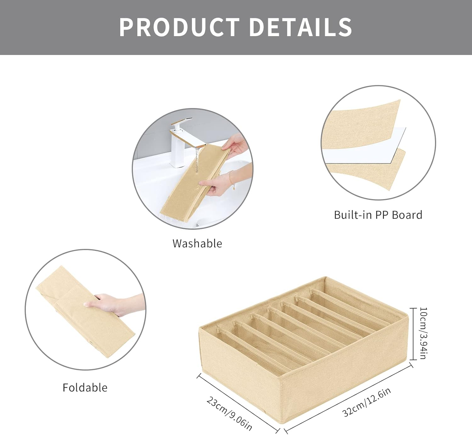 2 SIZES FOR YOU TO CHOOSE: This clothes organizer for folded clothes has 2 sizes, the Small size is suitable for thin T-shirts, tank tops, camisoles, baby clothes, etc.; the Upgrade Height size is an optimized version of the Small size, making it more suitable for adult T-shirts. You can choose the size based on the type of clothes you need to organize. 8 Grids-Small size is 32 x 23 x 10 cm / 12.6 x 9.06 x 3.94 in. SPACE SAVER: The drawer dividers are perfect to save space for your closet, drawer, wardrobe and cabinet, it massively improves the utilization of your drawer space, also you can be easier to find which one you want, saving much time on picking your items. VERSATILE CLOSET ORGANIZER: The closet organizer is perfect for organizing your thin t-shirts, tank tops, camisoles, tights, leggings, lingerie, baby clothes, underwear, socks when you finish laundry and easy to access them while you need it. PREMIUM QUALITY MATERIAL: The clothes organizer for folded clothes are made of PBT fabric, which is moisture-proof and very durable. The square boards are made of PP (Polypropylene), which is high heat-proof, smooth and light. These drawer organizers for clothing are washable, but the fabric contains a hard PP board, so please wash them by hand instead of using the machine. EASY TO ASSEMBLE: You can quickly assemble this clothes drawer organizer by inserting the supported PP board. And you can fold it when you don't need it without taking up your drawer space. Product Description 4 Pack Drawer Organizers for Clothing Multifunction Our storage organizer boxes are perfect for storing your t-shirts, tank tops, camisoles, tights, leggings, lingerie, baby clothes, underwear, socks, etc. Washable You can rinse the clothes organizers to keep them clean. One Grid, One Object With a compartment design, sorting and managing different colors and different types of clothing. About Qozary Storage Box Type: 4 Pack Drawer Organizers for Clothing Color: Grey Sise: 32 x 23 x 10 cm / 12.6 x 9.06 x 3.94 in Material: Cationic Cloth Fabric Washing: Washable, Do Not Iron, Open and Dry Lightweight & Easy to Assemble Product Details Exquisite Stitching Mesh Dividers High Quality Fabric How to choose the organizer suitable for you? 8 Grids-Small Suit for Thin T-shirt, Tank Tops, Camisoles, Baby Clothes, Underwear, Lingerie, Socks And Other Small Items. Compartment size About 9.06x1.57 inches 5 Grids-Small Suit for Short Sleeve T-shirt, Tights, Leggings, Gloves, Scarves, Beanie Hats Compartment size About 9.06x2.52 inches 5 Grids-Medium Suit for Long-sleeved T-shirts And Other Adult Clothing Compartment size About 11.8x2.52 inches
