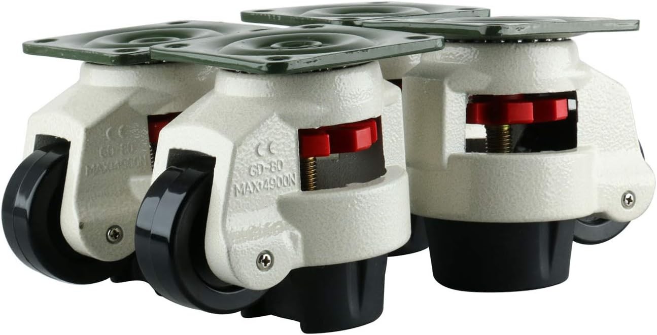 Description: Leveling caster is a kind of simple, elegant and advanced caster which features simple operation and easy adjustment A perfect alternate to the non-working casters of machines which are hard to move. After installation of appropriate numbers of leveling casters, any piece of equipment or product can be easily moved into position Once in the desired position, it's anti-vibration foot can be adjusted to a low position to make objects completely stationary and relieve the wheel of the objects weight. Application: Perfect for electronic equipments, test equipments, semiconductor equipments, medical machineries, production equipments, large equipments, communications equipments, computer support and other precise instruments. Features: Made of high quality material : carbon steel stamping top plate, non-marking and "no smell" NBR rubber pad, aluminum body, nylon wheel and handle, powder coat High wearability, low noise, can be moved easily and neatly Large capacity : one caster 1102lbs, 4 casters 4408lbs Retractable foot adjustable height for easy moving and completely stationary condition Can be used on uneven floor Specification: Model: GD-60F Material: carbon steel, NBR, aluminum, nylon, ABS Wheel Diameter:63mm/2.5inch Width of Tread:30mm/1.2inch Hardness of Tread: 70 Shore D Size of Plate:90x90mm/3.5x3.5inch Plate Hole Centers:70x70mm/2.75x2.75inch Plate Hole:9mm/0.35inch Leveling Extent:15mm/0.59inch Overall Height:103mm/4.1inch Load Capacity of One Caster:500kg/1102lbs Load Capacity of Four Casters:2000kg/4408lbs Package Included: 4 x 500kg/1102lbs Leveling Casters Mounting Screws