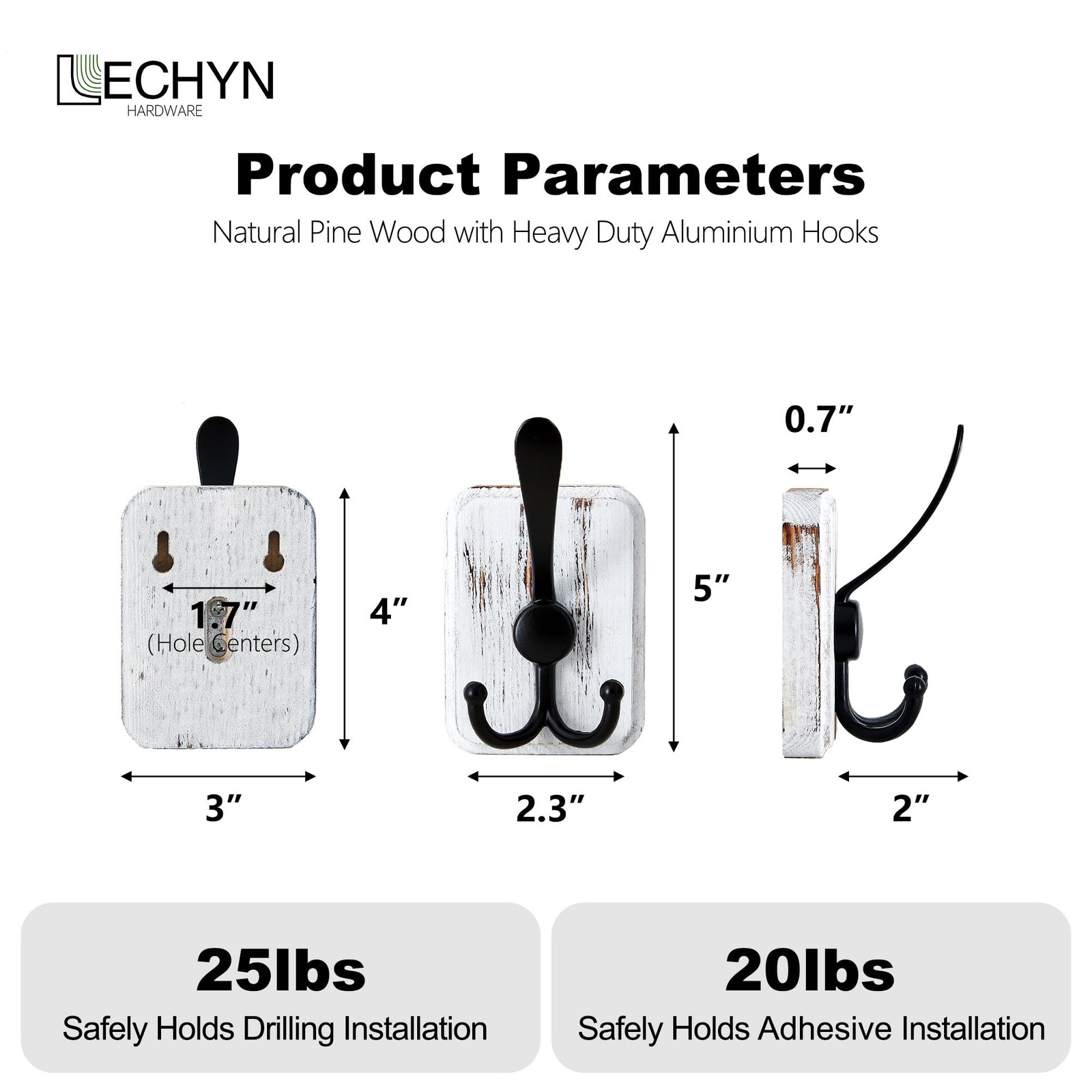 [Size and Loadbearing]: Size: 4"(100mm)(L) x 3"(75mm)(W) x 0.7"(18mm)(Thick). Weight capacity: The Loadbearing of Drill hole installation is 40 pounds, and the Loadbearing of glue installation without drill and screw is 20 pounds. [Durable and Sturdy]: Our hooks are made of thick and durable iron, which is solid and sturdy. The hooks are also designed to withstand wear and tear, ensuring long-lasting performance. The base is a solid, natural pine. [Effortless Installation]: Complete with easy-to-follow installation instructions and all necessary mounting hardware. For adhesive installation, ensure thorough and secure pressing for optimal adhesion. [Farmhouse Rustic Elegance]: Our hanging hooks embody the charm of village retro decor, crafted to complement a wide array of rustic styles. These versatile coat hooks cater to your diverse home decoration requirements, infusing warmth and character into every corner. Ideal for the living room, hallway, bathroom, kitchen, entryway, mudroom, or closet, they neatly organize your coats, robes, towels, backpacks, hats, and even kitchen essentials. [After-Sales Support]: Should you have any inquiries regarding our products or their quality, please do not hesitate to reach out to us. We are committed to promptly addressing your concerns and providing a satisfactory response.