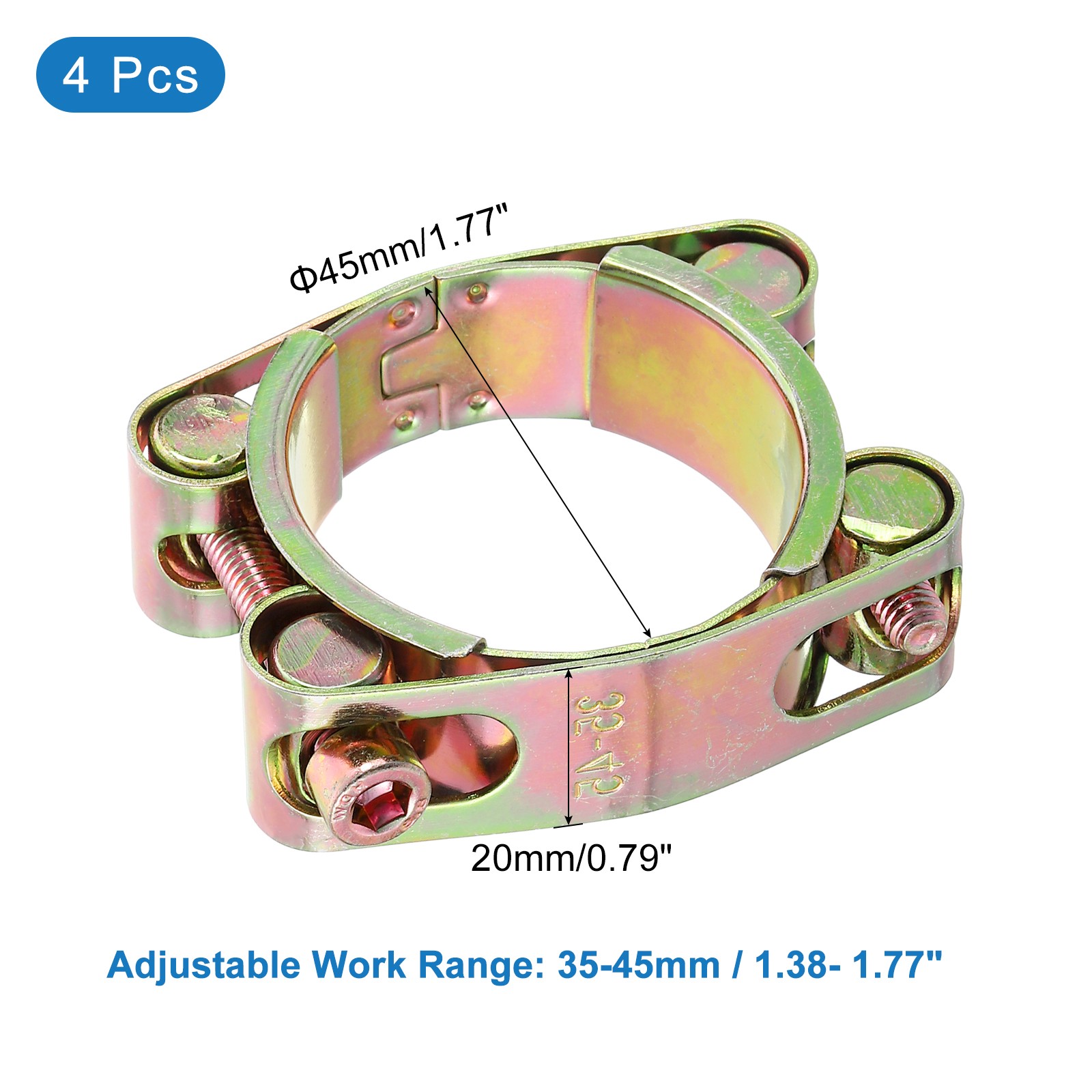 Document Description:[Material] - The T-bolt hose clamp is made of galvanized, which is anti-rust and anti-corrosion. This material has good performance, high temperature resistance and durability, not easy to deform, and is suitable for long-term indoor and outdoor use.[Easy to install] - The T-bolt hose clamp adopts a detachable installation design, you can install the hose clamp without disconnecting the pipe. And the working range is adjustable, just turn the screw with a wrench to adjust to the range you want.[Design] - The self-locking nut design of the hose clamp prevents the hose clamp from loosening, provides a leak-free connection and improves the tightening effect. This T-bolt can achieve a better leak-proof effect. Its flange design avoids scratching the hose and provides effective protection for the hose.[Wide Application] - T-clamps are widely used in industry, automobiles, special equipment and household purposes, and can be used to fix various oil pipes, water pipes, automobile intake or exhaust hoses, radiator hoses, irrigation system hoses, water pump hoses, etc.Specification:Material: Galvanized IronWidth: 20mm / 0.79"Thickness: 1mm / 0.04"Adjustable Range: 35-45mm/1.38-1.77inchPackage Listing:4Pcs x T-Bolt Hose Clamp 4 Pack T-Bolt Clamp, 0.8" Adjustable Tube Clamps 35-45mm for 1.38"-1.77" ID Description: [Material] - The T-bolt hose clamp is made of galvanized, which is anti-rust and anti-corrosion. This material has good performance, high temperature resistance and durability, not easy to deform, and is suitable for long-term indoor and outdoor use. [Easy to install] - The T-bolt hose clamp adopts a detachable installation design, you can install the hose clamp without disconnecting the pipe. And the working range is adjustable, just turn the screw with a wrench to adjust to the range you want. [Design] - The self-locking nut design of the hose clamp prevents the hose clamp from loosening, provides a leak-free connection and improves the tightening effect. This T-bolt can achieve a better leak-proof effect. Its flange design avoids scratching the hose and provides effective protection for the hose. [Wide Application] - T-clamps are widely used in industry, automobiles, special equipment and household purposes, and can be used to fix various oil pipes, water pipes, automobile intake or exhaust hoses, radiator hoses, irrigation system hoses, water pump hoses, etc. Specification: Material: Galvanized Iron Width: 20mm / 0.79" Thickness: 1mm / 0.04" Adjustable Range: 35-45mm/1.38-1.77inch Package Listing: 4Pcs x T-Bolt Hose Clamp Hot Item Payment 1.We accept eBay payment . 2.Payment must be received within 7 business days of auction closing. Shipping 1.We ship to your eBay or Paypal address. Please make sure your eBay and Paypal address is correct before you pay. 2.Items will be shipped within 1-3 business day when we received payment. 3.Delivery time depends on destination and other factors. Description Policy 4 Pack T-Bolt Clamp, 0.8" Adjustable Tube Clamps 35-45mm for 1.38"-1.77" ID Description: [Material] - The T-bolt hose clamp is made of galvanized, which is anti-rust and anti-corrosion. This material has good performance, high temperature resistance and durability, not easy to deform, and is suitable for long-term indoor and outdoor use. [Easy to install] - The T-bolt hose clamp adopts a detachable installation design, you can install the hose clamp without disconnecting the pipe. And the working range is adjustable, just turn the screw with a wrench to adjust to the range you want. [Design] - The self-locking nut design of the hose clamp prevents the hose clamp from loosening, provides a leak-free connection and improves the tightening effect. This T-bolt can achieve a better leak-proof effect. Its flange design avoids scratching the hose and provides effective protection for the hose. [Wide Application] - T-clamps are widely used in industry, automobiles, special equipment and household purposes, and can be used to fix various oil pipes, water pipes, automobile intake or exhaust hoses, radiator hoses, irrigation system hoses, water pump hoses, etc. Specification: Material: Galvanized Iron Width: 20mm / 0.79" Thickness: 1mm / 0.04" Adjustable Range: 35-45mm/1.38-1.77inch Package Listing: 4Pcs x T-Bolt Hose Clamp Hot Item Payment 1.We accept eBay payment . 2.Payment must be received within 7 business days of auction closing. Shipping 1.We ship to your eBay or Paypal address. Please make sure your eBay and Paypal address is correct before you pay. 2.Items will be shipped within 1-3 business day when we received payment. 3.Delivery time depends on destination and other factors.