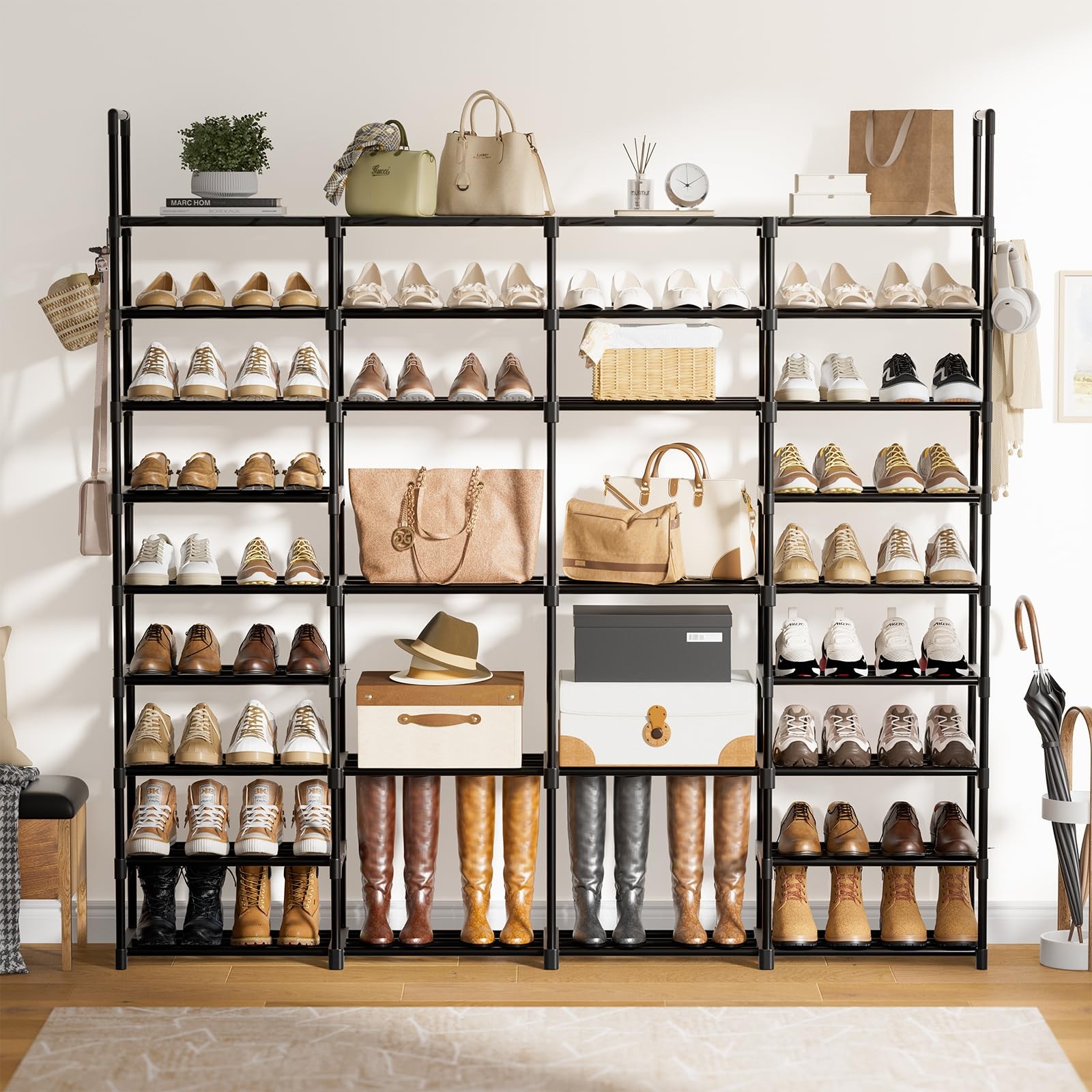 4 Row 9 Tiers Extra Large Shoe Rack 72-80 Pairs Big Tall Metal Shoe Shelf, Heavy Duty Shoe Rack Organizer for Closet Entryway, Boot Rack Storage Stackable Shoe Rack for Garage Black Store Up to 64-68 Pairs of Shoes: The tall shoe rack is 66.60x9.84x60.30 Inches.The heightened design has more space and can hold 64-68 pairs of shoes to keep your limit space well organized. Different height levels fit boots, high heels, shoe box or other larger access4 Row 9 Tiers Extra Large Shoe Rack 72-80 Pairs Big Tall Metal Shoe Shelf, Heavy Duty Shoe Rack Organizer for Closet Entryway, Boot Rack Storage Stackable Shoe Rack for Garage Blackories. Durable & Sturdy Structure: The large shoe storage is made of powder-coated metal tubes and high quality plastic parts. Stable durable sturdy shoe tower shoe shelf. The diameter of metal tube is 13mm, which enables this big shoe rack load much heavier duty and more durable while using. And the powder-coated finish does not rust or corrode with normal use, it is perfect for your everyday organization. 9-Tier Shoe Rack: Featuring a compact profile, you can easily set this metal shoe rack in the hallway, living room, bedroom, or garage. It helps you maximize your vertical space while saving more floor space for other items—good news for small areas! Easy To Assemble: We have detailed installation instructions, all accessories are coded, and the location of each accessory is marked.Comes with user manual to help you assemble the extra large shoe rack quickly and easily. Customizable Design: Arrange the tall shoe organizer layout to match your items' height. It can even be split into 2 or more racks. Tailor it to cater to your unique storage requirements, whether in a closet, garage, or storage room!