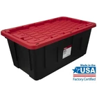 Organize clutter and hide unused items with the Hyper Tough 40 gallon snap-lid plastic storage tote. Made of durable polypropylene, the black storage tote allows you to hide away things you don’t want to be seen while the red snap-lid adds a pop of color to your space. The 2-point snap-lid ensures your items are safely secure during storage or transport. The specially molded lid allow you to stack multiple totes on top to prevent toppling and maximize storage space. Protect your valuables by utilizing the 6 tie-down holes made for zip-ties and padlocks. The long lasting Hyper Tough tote works great in basements, closets, pantries, sheds, barns, and attics. This tote is great for organizing household products, gardening supplies, pet treats and supplies, shoes, clothing, seasonal gear like boots, sporting equipment such as golf balls, tennis balls, or drill cones, and many other items. Also available in multiple sizes in clear and red (15 Gallon and 27 Gallon) or in black and red (5 Gallon, 12 Gallon, 17 Gallon, 27 Gallon, 40 Gallon, 50 Gallon). Use these storage totes as a toy box for toy storage. These storage boxes are great for tidying during the holiday season for christmas decorations such as ornament storage or wreath storage. Make holiday storage a breeze by using these storage bins with lids that can be used for wrapping paper, ornaments, or any Christmas storage. Sturdy black plastic construction resists rust, dents, stains and peeling to ensure lasting use Stackable lid design creates stability and reduce toppling when multiple storage bins are stacked Snap-Fit Lid lip keeps your content from spilling or falling out Lockable Lid comes with holes ideal for zip-ties or padlocks to keep your items safe and secure Exterior Dimensions - 38.2 IN W X 22 IN D X 16.4 IN H (97 cm x 55.9 cm x 41.6 cm) Easy to clean surface Indoor or Outdoor use Made from recycled materials Reusable Set of 2 – Includes 2 black bases and 2 red lids Weight – 9.3 lbs per unit Available in multiple sizes: 5 Gallon, 12 Gallon, 17 Gallon, 27 Gallon, 40 Gallons and 50 Gallons