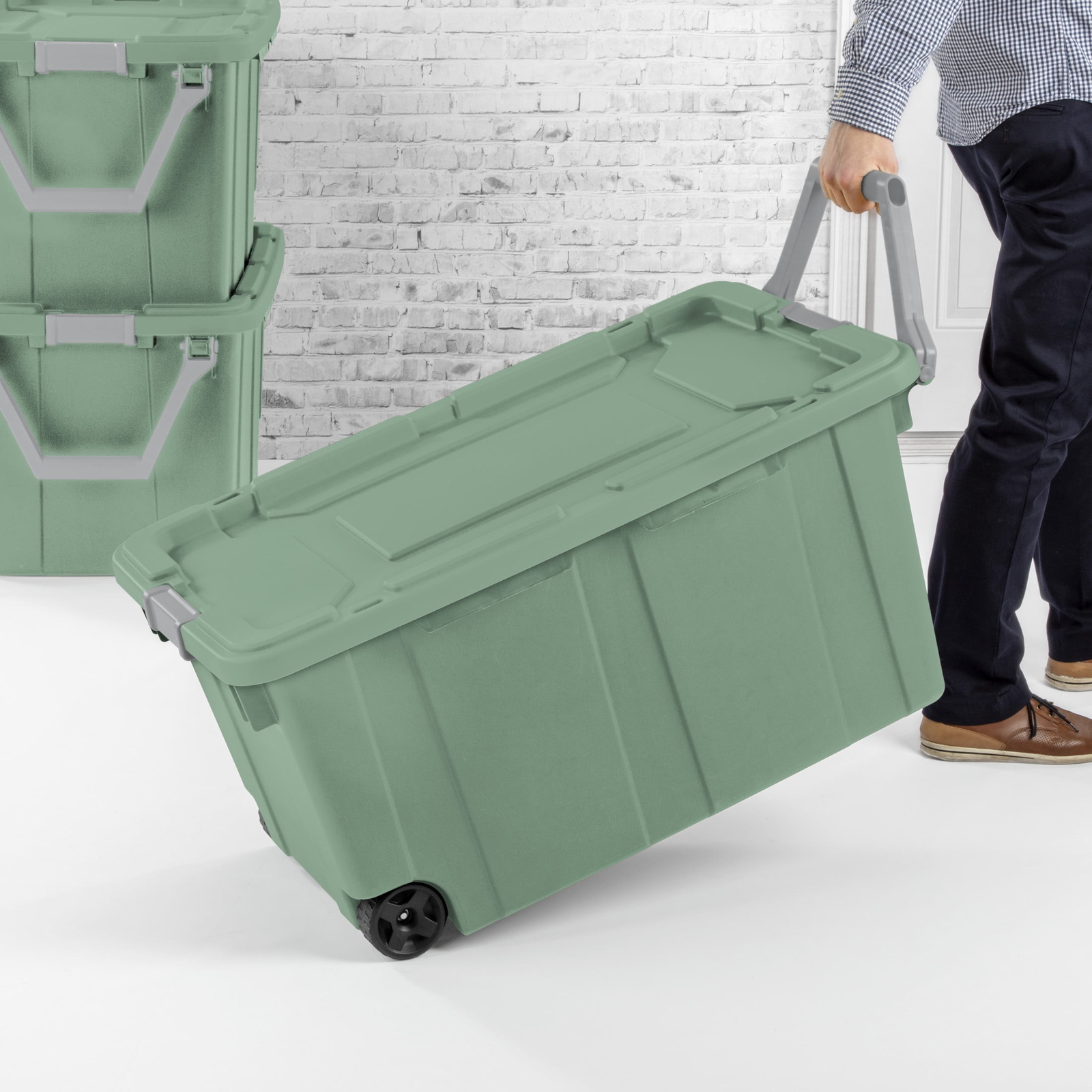 Bring order to garages, basements, and attics with the heavy-duty design and unique features of Sterilite’s Industrial Tote line. Be confident that stored items will stay protected in the durable 40 Gallon Wheeled Industrial Tote, the ideal portable solution for storing larger and heavier supplies. The grooved lid design and keyholes provide options for tie-downs to simplify transportation, and keep totes in place in the back of a pick-up truck. The ergonomic handle rotates up for easy pulling while the large wheels and metal axle allow for rolling over rough surfaces. The innovative drip-resistant lid provides maximum protection against items getting wet, while the tight-fit lid keeps items contained. The robust latches offer extra security that the lid will stay attached to the base, and the textured surface makes for a sure grip when carrying. The deep recessed lids provide stability when stacking for efficient use of storage space. Channeled walls provide added strength and help to resist crushing under heavier loads. The 40 Gallon Wheeled Industrial Tote is ideal for more active storage needs, store camping equipment, sports gear, tools and workshop supplies, and other bulky items. The overall assembled dimensions of this item are 36 3/4" L x 21 3/8" W x 18" H. Sterilite Adult Plastic 40 Gal. Wheeled Industrial Tote Green Sage Outside Dimensions: 36 3/4" x 21 3/8" x 18" Interior Dimensions at bottom: 30 1/2" x 16" x 17 1/8" Heavy-duty construction with robust non-slip grip latches Ergonomic handle rotates up for easy pulling and large wheels with metal axle allow for rolling over rough surfaces Deep recessed lids offer secure stacking capabilities helping to maximize available storage space Tight fit drip-resistant lid provides maximum protection against items getting wet BPA-free and phthalate-free