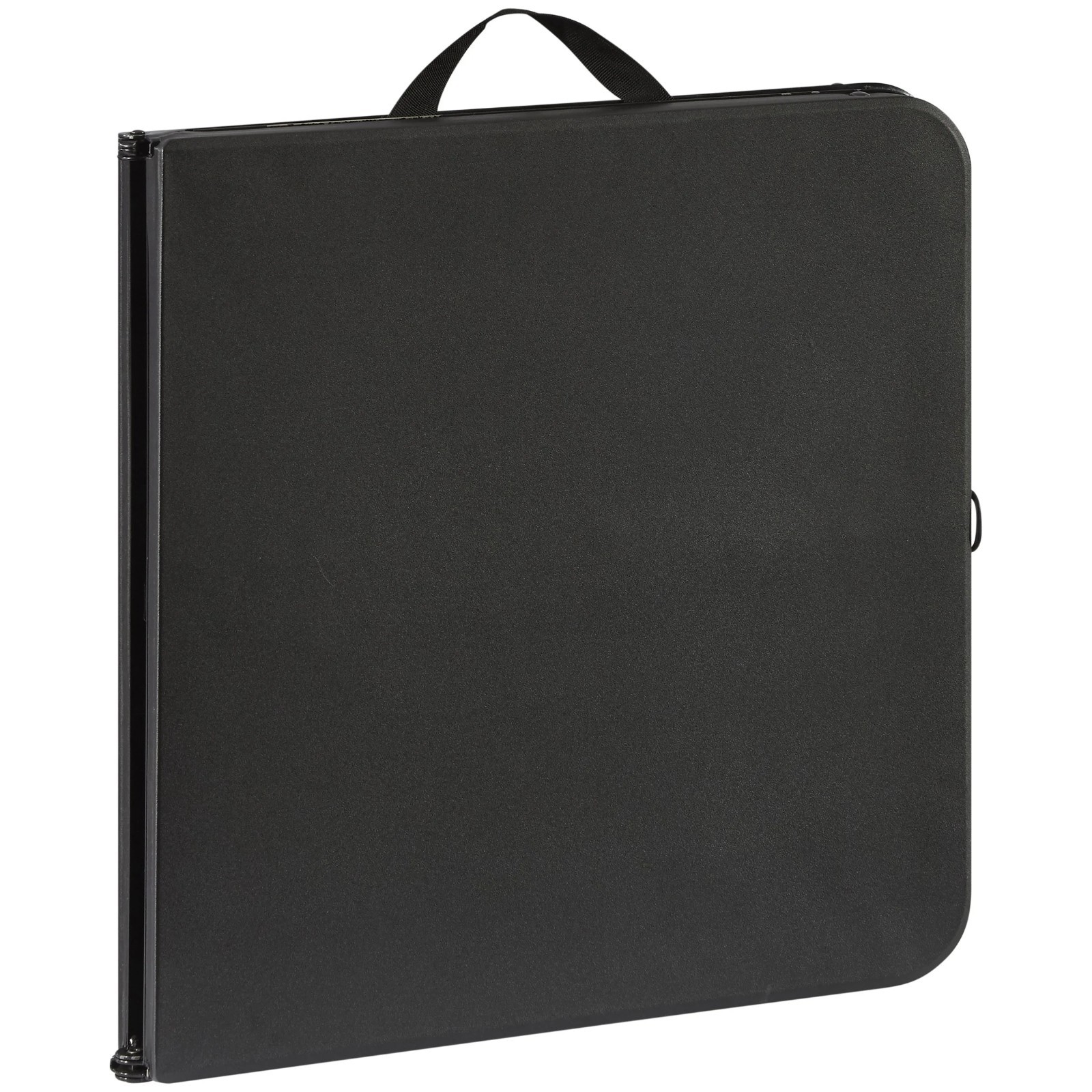 Product details Provide all of the table spaces that you need in all kinds of settings with the 40" Fold-in-Half Table in Rich Black. This versatile rectangular table is sturdy and durable, made with reliable materials, folds for easy storage and transportation, and adjusts to three different heights. When you're finished using it, just fold in the metal legs, fold the table in half, and your new compact table is ready for transport! Its classic black color is sure to fit in at any gathering in any setting, and its spacious expanded 40" long table-top is ideal for holding a wide variety of foods, crafts, or whatever items you are working with! It's great for everyday use both indoor and outdoor, as a serving table, craft supply table, outdoor meal table, or for whatever purposes you may need. The plastic tabletop is easy to clean with no fuss just wipe it down with a damp cloth, and it will look as good as new! The carrying handle makes it perfect for taking on the go, for outdoor barbecues, game nights, school activities, parties, or tailgating events. The tabletop is large enough to be able to sit the whole group down around the table, so all of your friends and family can be included. Product Dimension:40" W x 20" D x 17.71" - 24.4" - 28.03" H Comfortably seats 4 adults Easily folds in half for convenient storage Classic black color coordinates with almost any decor! Includes a built-in carry handle, for easy transportation Rubber stoppers on the legs for added grip on floor surfaces Appropriate for use indoors or outdoors Easy-to-clean resin surface Strong durable powder-coated metal construction Number Of Pieces: 1 x folding table