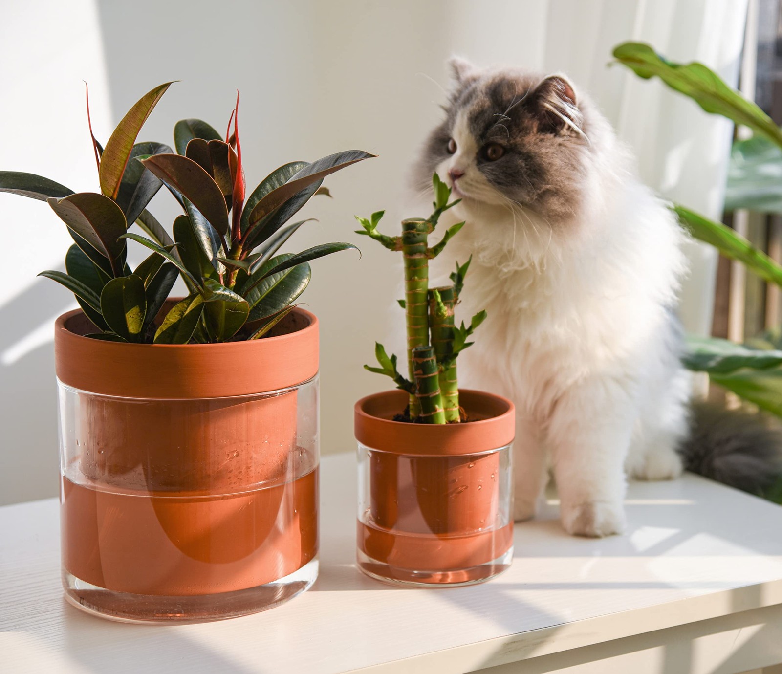 4 Inch 6 Inch Self Watering Planter Pots, Terracotta Clay Pots with Glass Reservoir for Indoor Plants, Herbs, Flowers, 52-A-G-46 Self-Watering System: The bottom quarter of the terracotta pot is unglazed, allowing plants to absorb water through the pot walls. Easy Refilling: The glass reservoir at the top allows excess water to be stored and easily refilled, ensuring plants receive the right amount of moisture. Compact Size: The medium size is 6.5" tall and 4.7" in diameter, while the small size is 4.1" tall and 3.0" in diameter, making them ideal for indoor plants. No Drainage Holes: The lack of drainage holes prevents water or soil leakage, keeping your tabletop clean. Hassle-Free: If you encounter any issues, offers hassle-free replacement or refund.