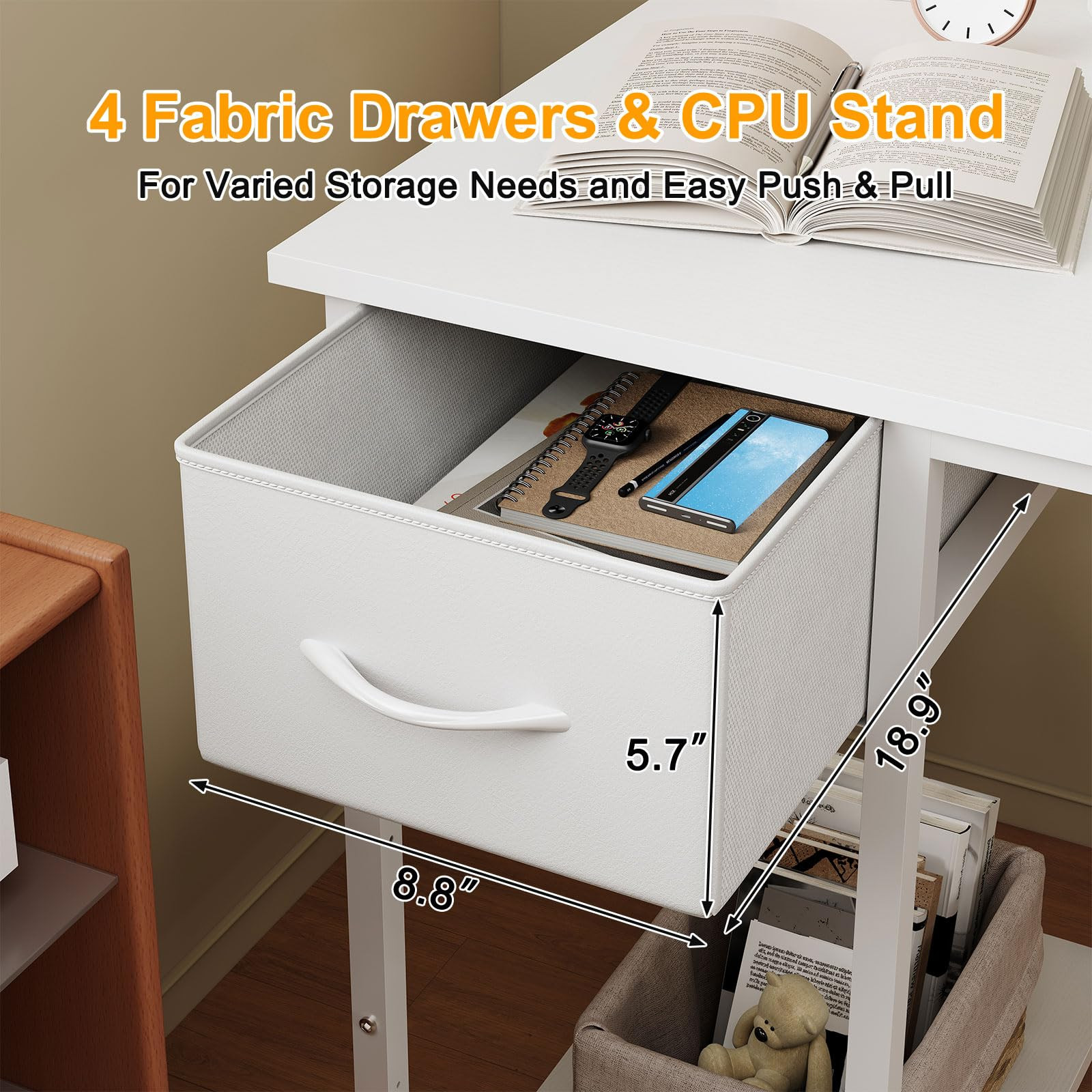 Desk with 4 drawers for organized storage of office supplies and personal items. Flexible drawer layout lets you install drawers on either side as per preference. Sturdy metal frame and particleboard ensure durability; adjustable feet for stability. Easy assembly with clear instructions, numbered parts, and all tools included. Customer Support – is committed to providing exceptional customer service, ensuring a seamless and satisfying experience with 24-hour support.