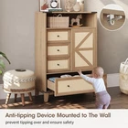 Drawers Dresser for Bedroom, 47" Farmhouse Rattan Storage Cabinet with Sliding Barn Door & Open Storage, Tall Wood Drawer Organizer for Bedroom, Entryway, Hallway, Wood Oak Product Description About this item Rustic Farmhouse Style: This rattan wooden 4-drawer dresser is 15.63"D x 31.42"W x 47.17"H. It has 1 open storage compartment, 4 drawers in 2 sizes, as well as space-saving sliding barn doors and 1 adjustable shelf. The combination of drawers and sliding barn doors provides ample storage for socks, clothes, linens, cosy blankets or pillows. This chest of drawers blends farmhouse style with richly detailed natural wood vines for a unique and elegant look 4-Drawer Dresser with Sliding Barn Door: This sliding barn door dresser features space-saving farmhouse barn doors that slide open on metal tracks to reveal adjustable shelf space, giving you the freedom to hide or display storage. The shelves have 3 height adjustable as well as removable shelves to add extra storage space, so blankets, pillows, and family members' clothing can be well organised Multi-purpose Wood Dresser: This clean-lined rattan wood 4-drawer dresser with black knobs and metal arrowhead accents is the highlight of any transitional or contemporary style room. Whether it's providing storage for your bedroom, decorating your living room, or welcoming guests in your entryway, this solid wood dresser blends in perfectly and enhances the ambiance of your living room Safe and Reliable Quality: This bedroom dresser contains an anti-tip mechanism that secures to the wall to prevent tipping and keep children safe. This 4-drawer dresser features a randomly distributed natural tree texture, making each piece you receive unique and adding a deeper farmhouse feel. Thickened base improves stability and load-bearing capacity, preventing scratches on flooring Buy with Confidence: All parts and accessories of the chest of drawers are coded and can be easily assembled with the product assembly instructions. The back of the chest of drawers is equipped with an anti-tipping device to ensure safety. The wood color finish adds character and charm to your bedroom and living room, creating an intimate atmosphere Tall Rattan Dresser for Home Organization and Storage Natural rattan is healthy and natural simplicity and it has good light resistance and wear resistance, making the rattan dresser more comfortable and practical Large Capacity Space for Various Storage Needes This dresser features 1 large drawer, 3 small drawers, 1 storage compartment, and shelves with 3 height-adjustable and removable shelves that add extra storage space for you and your family to organise a variety of items Natural Rattan 4 Drawers Dresser The natural wood dresser is handcrafted with rattan weaving techniques for a perfect visual effect. A perfect blend of classic aesthetics and modern sensibilities, this dresser highlights the essence of mid-century modern style, elevating your space with understated charm. Transcending trends and embodying timeless beauty, this sophisticated dresser will refresh your room. A Versatile Statement for Bedroom, Living Room, Hallway, and Entyway This sliding barn door dresser has 7 storage compartments for anything from blankets, underwear and clothes to nappies and toys Previous page Next page Metal Corner Decoration Eye-attractive farmhouse decor for long-term use Black Knob Black handle, comfortable grip, smoother opening and closing. Smooth Metal Slides Adopted premium metal slides, the drawers can withstand long-term push and pull, keeping you company in the long run. Solid Wood Legs Supported by solid wood legs, each large wood drawer can hold up to 50lbs, and the wood tabletop can hold up to 100 lbs. Rattan Storage Cabinet Set