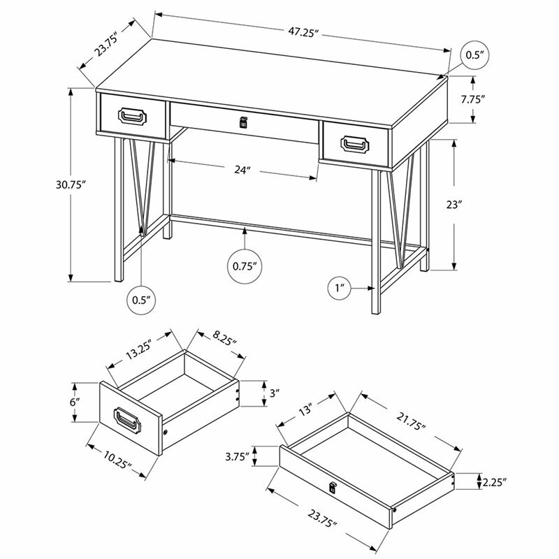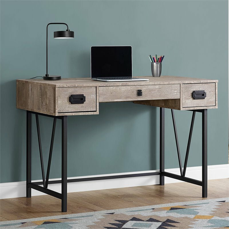 Industrial meets rustic charm in this highly functional contemporary designed computer desk. Accented with strong black metal legs in a unique design, with plenty of storage that includes two side drawers with retro style metal pulls, and a wide middle drawer with a leather pull, all on smooth metal glides. The spacious tabletop constructed with thick paneling, in a smooth laminate taupe reclaimed wood-look finish can easily hold your computer and other office essentials. This stylish computer/writing desk will be a standout whether you place it in a corner of your living room, family room, or home office space. Features: Finish: Taupe and Black Material: Particle Board, Hollow-Core, Laminate, MDF, Metal Finished in reclaimed wood-look with attractive black legs 2 side drawers on metal glides accented with trendy black metal pulls 1 wide middle drawer on metal glides with a black leather pull Modern industrial style in a compact size suitable in any space Finished on all sides Specifications: Product Dimensions: 30.75" H x 47.25" W x 23.75" D Product Weight: 61 lbs