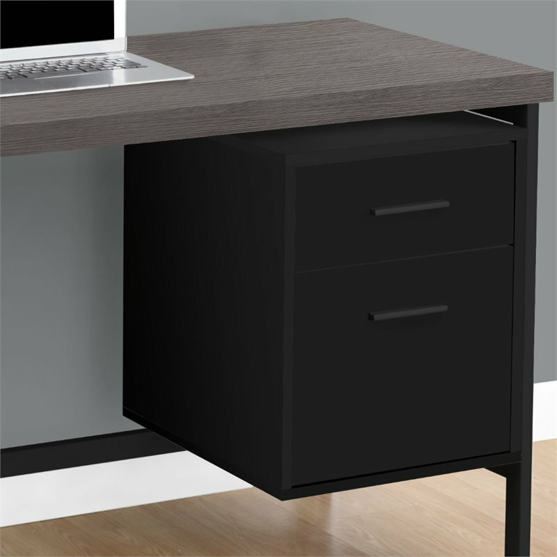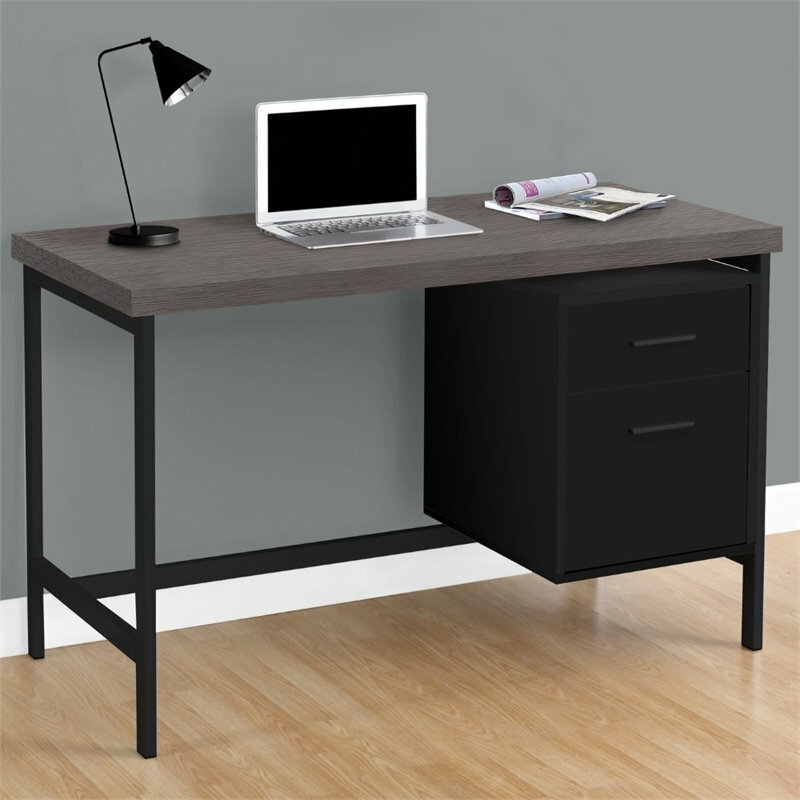 Sleek and contemporary, this black desk with a gray wood-look top, finished on all sides, is the perfect combination of function, durability and design in a modern form. With clean lines, a large, thick paneled surface and stylish silver metal legs, this piece will add pizzazz to any home office. Featuring a large storage drawer and a file drawer accented by black drawer pulls to help keep your office supplies and documents organized and desktop clutter free. This desk provides plenty of room to meet your working needs without compromising style making this a must have in any home office. Features: Finish: Black and Gray Material: Particle Board, Hollow-Core, Laminate, MDF, and Metal Large thick paneled work surface finished in a gray wood-look with a stylish black base 1 closed storage drawer 1 file drawer accommodates standard sized documents Contemporary industrial inspired design Finished on all sides Specifications: Product Dimensions: 30.75" H x 47.25" W x 23.75" D Product Weight: 75 lbs Drawer Dimensions: (Top) 6" H x 12.5" W x 13.25" D Drawer Dimensions: (File) 12.5" H x 12.5" W x 17" D Top Dimensions: 1.75" Thick Number of Drawers: 2