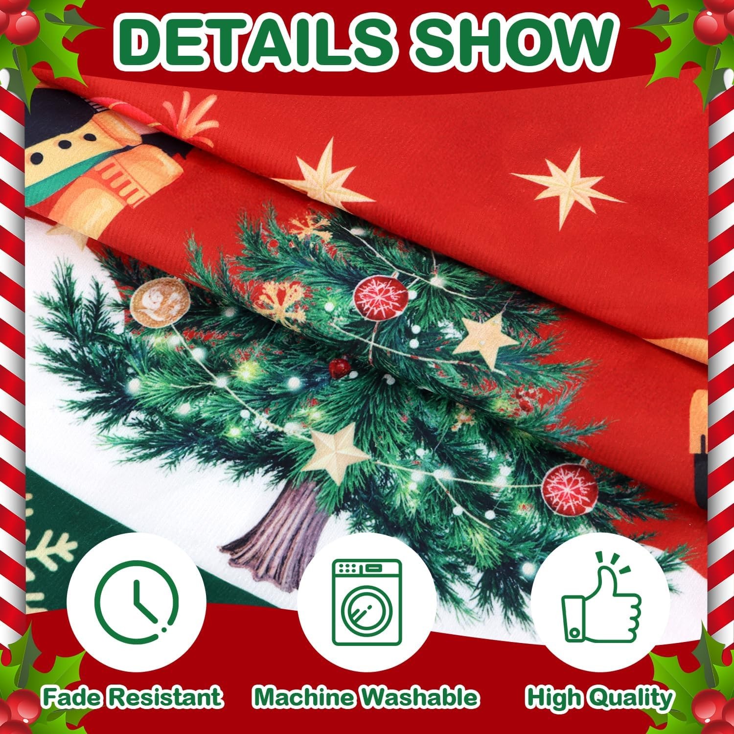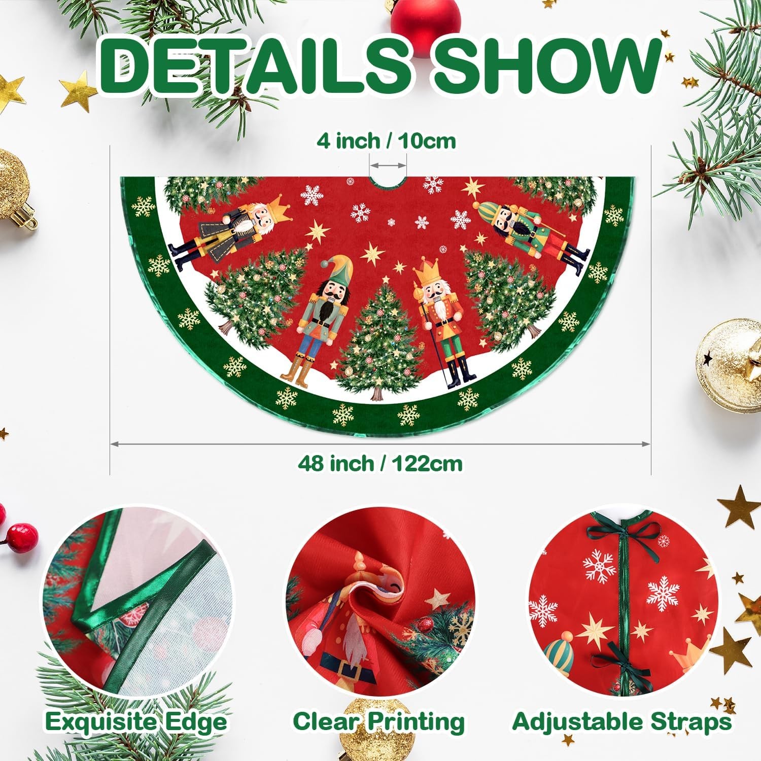 Free eBay listing template designed by dewiso.com 48 inch Vintage Nutcracker Christmas Tree Skirt, Snowflakes Christmas Tree Collar Soft Tree Mat, Xmas Winter Holiday Party Supplies Christmas Tree Decoration FREE AND FAST SHIPPING! Charming Nutcracker & Christmas Tree Design: This 48 inch Christmas tree skirt showcases adorable nutcrackers, decorated Christmas trees, snowflakes, and stars in classic red and green. It brings an instant, lovely, and strong Christmas vibe to your holiday setup. Premium Soft Polyester Material: Crafted from high quality polyester fabric, this Christmas tree skirt is soft to touch, durable, fade - resistant. It may be wrinkled upon arrival but irons smooth and stays wrinkle - resistant, ensuring long - lasting use for many holiday seasons. Perfect for 6-8ft Trees: With a 48 - inch diameter, this Vintage tree skirt provides ample coverage for the base of Christmas trees that are 6 - 8 feet tall, keeping your floors tidy from pine needles and ornaments. Ideal Christmas Gift: Looking for a thoughtful gift? This Nutcracker tree skirt is a excellent pick. Its charming design and practicality make it a great present for family and friends who love holiday decorating. Easy to Clean - Machine Wash on Gentle Cycle: Maintaining this tree skirt is a breeze. When it gets dirty, you can simply wash it in the washing machine on a gentle cycle. It retains its softness and vibrant colors, ready for years of Christmas celebrations. Product We offer a 30-Day Return Policy on items which you are not completely satisfied with. You have the option for a full-refund or an exchange of the item. No returns are available on items shipped outside of the US . Shipping We offer Free Shipping to the US and ship within 2 business days of payment, usually sooner. We use UPS express shipping. That's why your products are usually delivered within 3 days . Contact We try our very best to make sure every customer is completely satisfied. If there's a problem , message us! We're happy to help. 24/7 live chat available.