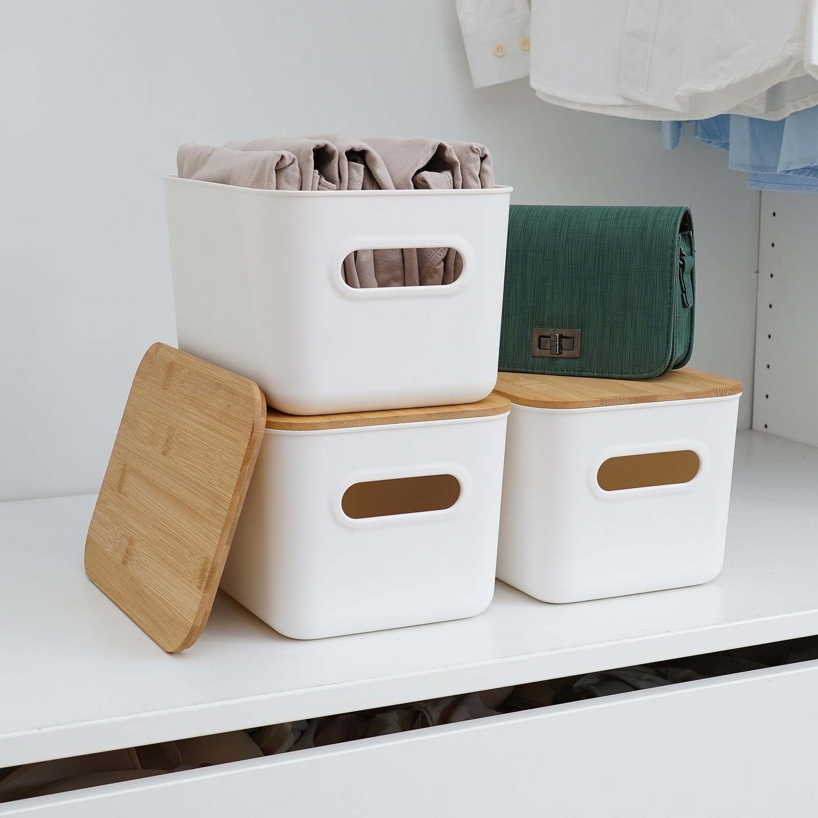 Citylife 4 PCS Storage Bins with Lids Plastic Storage Containers for Organizing Stackable Storage Box with Handle 【Combine Natural Stylish and Practical】The crisp white base pairs effortlessly with the natural bamboo lid to fit in with any decor. Great for living rooms, bedrooms, home offices, and even cabinets or closets. 【Thoughtful Size】Package includes 4 plastic storage bins with bamboo lids, single measuring: 10.23"L × 7.08"W × 6.22"H. 【Labels & Marker】Comes with 8 different shaped labels and 1 marker. Our customizable labels make storing and accessing belongings a total breeze. 【Stackable & Integrated Handles】Stacking and modular design for maximum space and nest together when not in use for compact storage. Built-in handle for easy removal from shelves. 【Durable & Sturdy】Made of durable PP5 plastic and premium bamboo. Please note that bamboo is a living material and some color changes may occur.