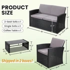 【VARIOUS COMBINATIONS】The furniture set consists of two single armchairs, a love seat and a coffee table, each of which can be moved easily, allowing you to arrange it according to the space of your home to improve space utilization 【SOFT & COMFORTABLE CUSHION】A sofa set comes with four thickened cushions and four soft pillows that can be removed with a zipper so you can clean the fabric cover; The surface of the cushion can protect it from water droplets, but it can't be exposed to rain for a long time; So the cushion must be promptly retracted in rainy days 【STURDY & DURABLE】Our four-piece sofa is crafted from a sturdy steel frame and delicate hand-woven rattan; It can withstand all kinds of weather; And can be quickly cleaned and put into use after a rainy day; Perfect for your living room, yard or poolside 【EASY TO CLEAN】Our outdoor four-piece set comes with a coffee table with a detachable tempered glass top, which is held in place by suction cups; You can put liquids like champagne on it and don’t worry about overturning it, as a glass tabletop can be restored with a simple wipe Payment 1. Payment should be completed within 3 (Three) days of auction closing. Or unpaid dispute will be filed for closing auction automatically. 2. If for some reason there is any issue with the payment, please contact us, and we will be glad to work with you to have it resolved. Shipping 1. Package handling only takes 3 business day at our warehouse, so please make sure entering correct payment and shipping information before checking out. 2. According to eBay policy, we only ship to eBay ADDRESS. Once your payment is completed, you can leave eBay note or click the button named “contact seller” in your purchase history if the changes are needed before we send the product. 3. If an address change is needed after sending your item, you will be responsible for any fees associated. 4. Orders placed on weekend will be shipped within 3 business days. Terms of sales 1. All of our items come with a 30-day return policy. We ensure all our items are new and in excellent condition prior to shipping. In the event that you receive the item that is not to the standards above, please contact us via eBay messages. All returns should be shipped with delivery confirmation.New items must be returned unused, undamaged, in the original packaging. 2. Please note that all returns must be pre-approved by us. Unauthorized returns will not be accepted. If you need to return, please check twice to confirm the item not work and contact our customer service representative, let us know the detailed problem and send us some pictures for confirmation. 3. All NON-seller mistake returns for refund are subject to 20% re-stocking fee and buyer should pay for the round-trip shipping fee. (E.g. you bought wrong model or wrong color). 4. We ONLY accept the return for original package. Please make sure that item has NO man-made sabotage. Used items will not be accepted for return. 5. We reserve the right to refuse any returns for objective reasons. Feedback 1. If you are satisfied with the product you received, please leave us positive feedback and 5 star comment, which will be highly appreciated. 2. If there is any problem about your order, please contact seller prior to leaving feedback, and we will be glad to work with you to have it resolved. 3.If you are dissatisfied for any reason, please do not be quick to leave negative or neutral feedback. We’ll try our best to resolve any problem for you to make EACH CUSTOMER 100% SATISFIED and always leave positive feedback to all our customers. Contact us 1.Before purchasing, you can contact us directly by clicking "Ask a Question" at bottom of this page. 2. After purchasing, you can contact us by clicking the button named “contact seller” in your eBay purchase history. 3. We will answer your question within 24 hours(except Holiday). FAQ Q: How do I pay for my purchase? A: We only accepts the payment method Paypal. Q: When will the item be shipped out? A: The item will be shipped within 3 business day once payment completed. Q: Where is my tracking number? A: Some of our parcels are shipped with tracking <, and u could check it as the following steps: Please log on your account. Click ”my eBay”----->”My Summary” or open your emailbox and find the shipping notification email. Q: How do I return an item? A: We accepts returns. Item must be returned within 30 days. You will be refunded within 5 working days of receiving your money back:The returned goods have been received. Please contact our customer service before you return an item.