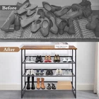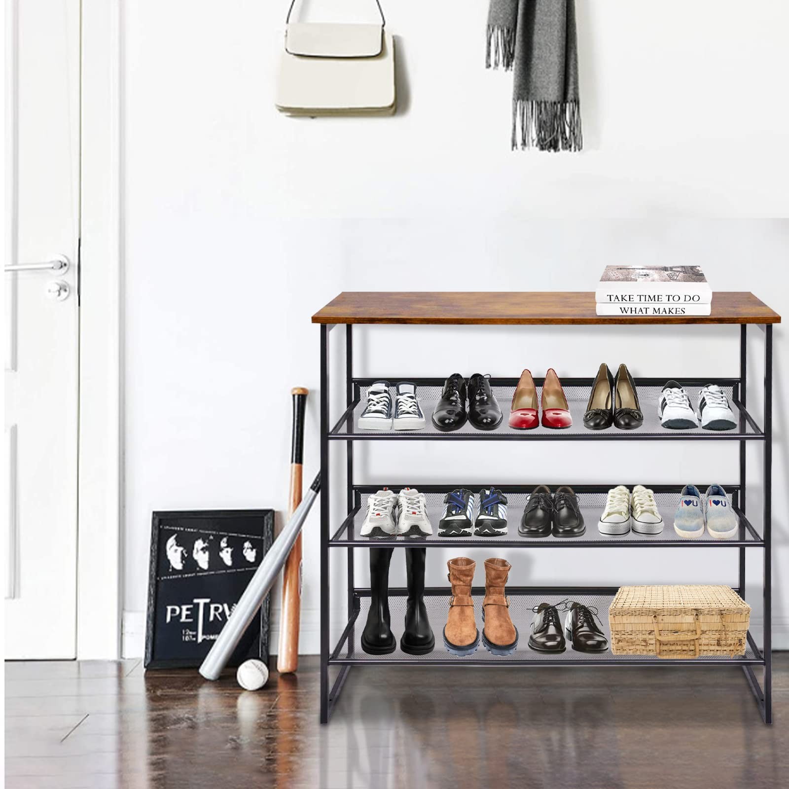 Modern Shoe Storage Freestanding Organizer 4-Tiers Tilting Adjustable Shoe Rack, Stable, Durable For High Heels, Entryways, Hallways, Closets BEAUTIFUL & GENEROUS: When your friends enter your entrance, they will be impressed by this attractive shoe rack, which is made of elegant wood panels and rustic brown and sturdy metal frames. PERFEC ORGANIZATIONT:Our shoe rack each layer can be placed 6 pairs of shoes, enough to meet the use of a family, let you get rid of shoes nowhere to put, let the home more clean and tidy STRONG INTERLAYER:The compartments of the shoe racks are made of iron plates with smaller intervals to keep the heels of women's heels from falling off. Behind the compartment is a baffle to prevent shoes from falling. ADJUSTABLE COMPARTMENT:The inclination of our compartments can be adjusted to level or tilt according to your usage habits. SIMPLE ASSEMBLE:Our shoe rack installation is very simple, we are equipped with the corresponding installation instructions, even if handed to your child can complete the installation in about 10 minutes.