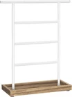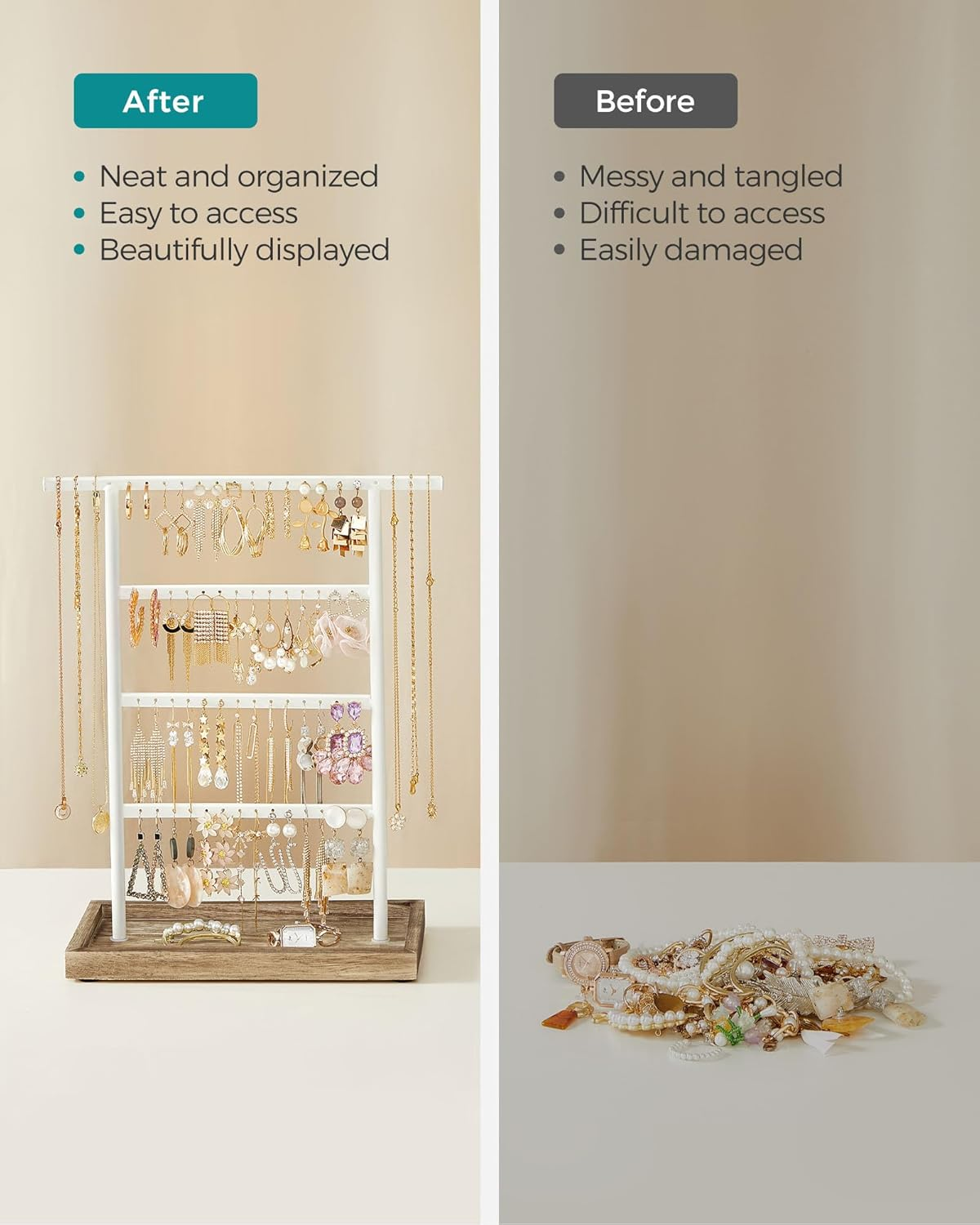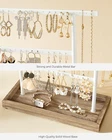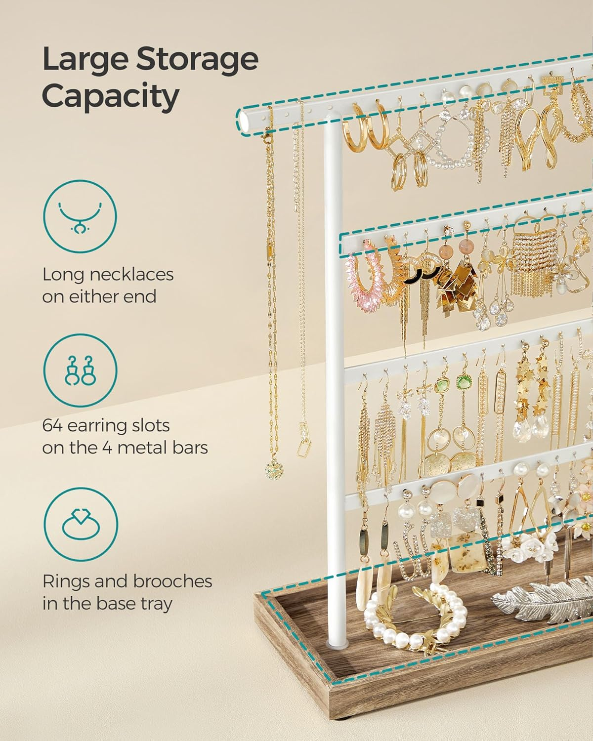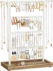 [4 x the Jewelry] If staying as a pair without losing the other half is your earrings’ quest, this jewelry stand is their dream come true. It offers 4 metal bars, 64 stud holes, to keep them safely in pairs, lines, and right in front of you to glitter [3 x the Convenience] Like jewels contributing to your happiness, small things are a delight—the base works as a tray for rings and brooches, the top bar reserves space for long necklaces, and the pads on the bottom protect any surface it stands on [3 x the Prettiness] White simple lines, white and brown tones, and all symmetrical beauty. This jewelry holder with an elegant flair accents your bling, brings life to your dresser, and even looks like a part of your home decor [2 x the Strength] Even though this jewelry organizer is beautiful enough to be out on display, it's durable, too. Built with robust steel and a solid base, it’s reliable for your precious diamonds, delicate pearls, and antique heirlooms [0 x the Worry] The assembly takes only 1 step—attach the metal part to the base with screws, and it’s done! Now you can hang your dangly jewels up and start deciding which pair to wear the next morning! Isn’t getting ready quicker now? Product Description Instead of ending up with a tangled mess or a bunch of lonely studs with no matches, your earrings will be tidy, safe, and easily accessible on this jewelry stand, dangling aloft on the 4 metal bars with 64 stud holes. The extra perk? Your rings can perch on the tray at the base! Several Shining Points You Don’t Want To Ignore: The earring organizer can hold up to 32 pairs of studs; The top bar is extended to accommodate longer necklaces or bracelets; The solid base features a lip you can use as a tray for rings and pins; The pads on the bottom prevent the surface it sits on from getting scratched; The assembly is a no-brainer that takes only one step; The combination of white metal and wood-colored base makes it a fancy gift. Specifications: Color: Wood Color, White Material: Metal Frame Product Size: 4.6"D x 11.5"W x 13.8"H (11.5 x 29 x 35 cm) Product Weight: 0.7 lb (0.3 kg) Package Contents: 1 x Jewelry Holder 1 x Assembly Kit 1 x Instructions