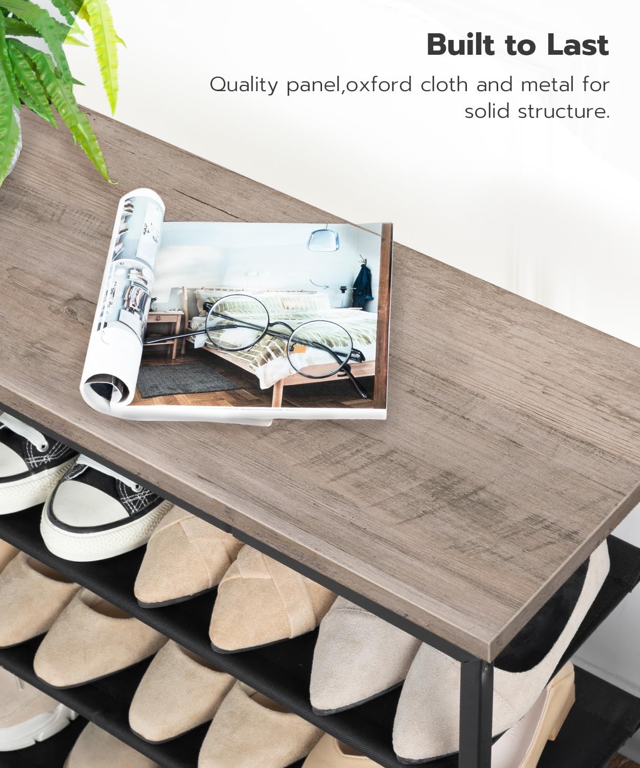 Shoe Rack, 4-Tier Shoe Storage Organizer with 3 Oxford Fabric Shelves Does the child take off his shoes once he gets home? See the mess at the entrance and have nowhere to stand? Let shoe rack help you solve this problem and keep the entrance clean and tidy immediately. Be a hero to change your family habits Specifications: - Color: Greige, Black - Material: Particleboard, Steel, Polyester Fabric - Product Size: 29.5’’ W x 11.2’’ D x 23.4’’ H (75 x 25 x 60 cm) - Product Weight: 12 lb (5.4 kg) - Max. Static Load Capacity of the Top Surface: 22 lb (10 kg) - Max. Static Load Capacity per Fabric Shelf: 11 lb (5 kg) Package Contents: - 1 x Shoe Rack - 1 x Anti-Tip Kit - 1 x Accessory Kit - 1 x Instructions 4-Tier Shoe Rack: Gone are the days of throwing shoes all over the place. On this 4 tier shoe rack, you can neatly store your sneakers, flats, and more. With removable layers, your high heels, boots can also be well placed Life Helper: Shoe rack is 29.5" W x 11.2" D x 23.4" H in size, ideal for entrances with tight space, entryway, closet, living room, bedroom, apartment and dormitory. Extending vertical space usage, this shoe rack provides you with a space-saving solution. You can also use it as a storage shelf. Unleash your creativity! Built to Last: The reasonable structural design enhances the stability of the shoe rack. Max load ability of the top is 22 lb with each shelf bearing up to 11 lb. 4 adjustable feet help keep balance at all times Material and Structure: This shoe rack is made of durable waterproof oxford cloth, particleboard and thickened iron pipe, featuring easier clean. The top wooden shelf can be used to place albums, plants, handbags and other items, beautiful and practical Easy Assembly: Easy to set up in just a few steps. With detailed instructions and clearly numbered parts, it does’ t take any time to assemble this shoe rack