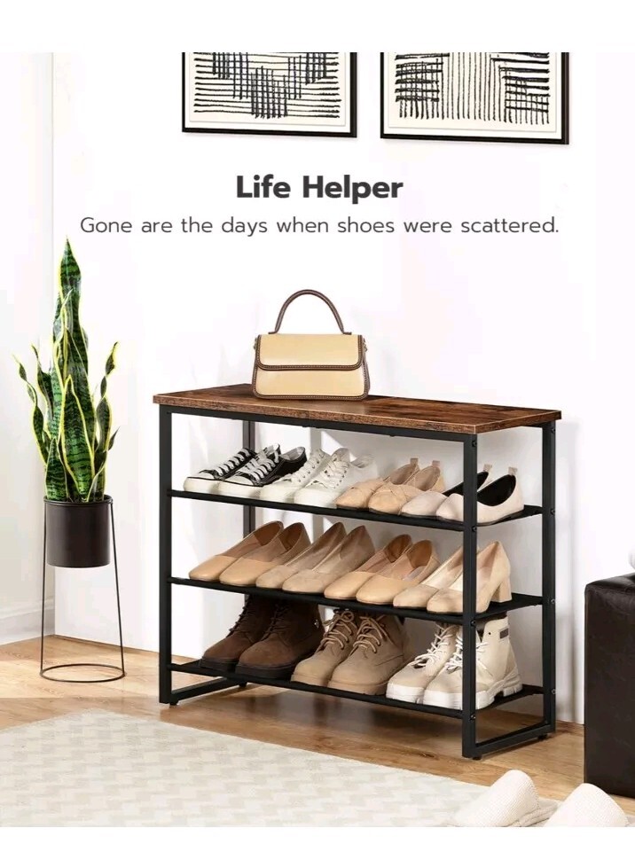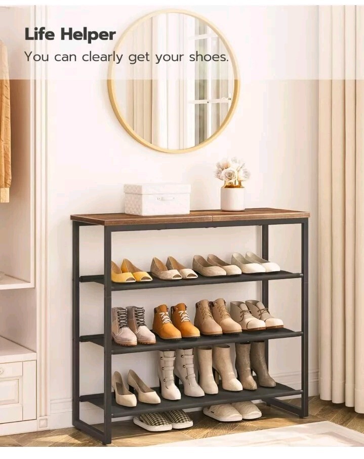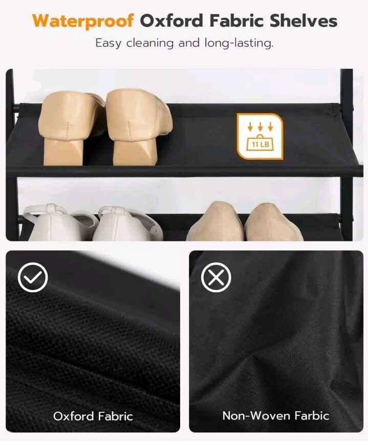 HOOBRO Shoe Rack, 4 Tier Shoe Storage Organizer with 3 Oxford Fabric Shelves and Top Panel, Holds 12-16 Pairs of Shoes for Entryway and Closet, Industrial, Rustic Brown BF47XJ01G1 Top Highlights Material Particleboard , Steel , Oxford Fabric Mounting Type Floor Mount Room Type Living Room, Bedroom Shelf Type Tiered Shelf Number of Shelves 4 Special Feature Waterproof, Space Saving, Adjustable 4-Tier Shoe Rack: Gone are the days of throwing shoes all over the place. On this 4 tier shoe rack for front door entrance, you can neatly store your sneakers, flats, and more. With removable layers, your high heels, boots can also be well placed Life Helper: Shoe rack is 29.5" W x 11.2" D x 23.4" H in size, ideal for entrances with tight space, entryway, closet, living room, bedroom, apartment and dormitory. Extending vertical space usage, this shoe rack provides you with a space-saving solution. You can also use it as a storage shelf. Unleash your creativity! Built to Last: The reasonable structural design enhances the stability of the shoe rack. Max load ability of the top is 22 lb with each shelf bearing up to 11 lb. 4 adjustable feet help keep balance at all times Material and Structure: This shoe rack is made of durable waterproof oxford cloth, particleboard and thickened iron pipe, featuring easier clean. The top wooden shelf can be used to place albums, plants, handbags and other items, beautiful and practical Easy Assembly: Easy to set up in just a few steps. With detailed instructions and clearly numbered parts, it does’ t take any time to assemble this shoe rack