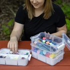 Discover theClear Plastic Storage Case with 28 Removable Jars – the ideal solution for your crafting storage needs. This clear, durable case measures 10 x 1.75 x 5 inches and comes with 28 well-sized jars for effortless bead and craft organization. The strong latches provide secure protection for your supplies, and the portable clear jar with a screw-top lid allows you to take your essentials anywhere, worry-free. Elevate your crafting experience with this stylish and practical clear storage companion! Versatile storage: The 4-Tier Snap Box is designed to store crafting, office, and home supplies, providing a convenient solution for organizing items. Easy to carry: This snap box comes with an organizer case that is easy to carry, allowing you to transport your supplies effortlessly. Secure and customizable: With 4 stackable and customizable locking tiers, this plastic craft storage box ensures that your supplies are securely locked in place during transportation, providing both safety and convenience. Durable and efficient: Organize your home in a durable and convenient way with this storage box, reducing the need to constantly keep track of your supplies and enabling you to focus more on the activities you love.
