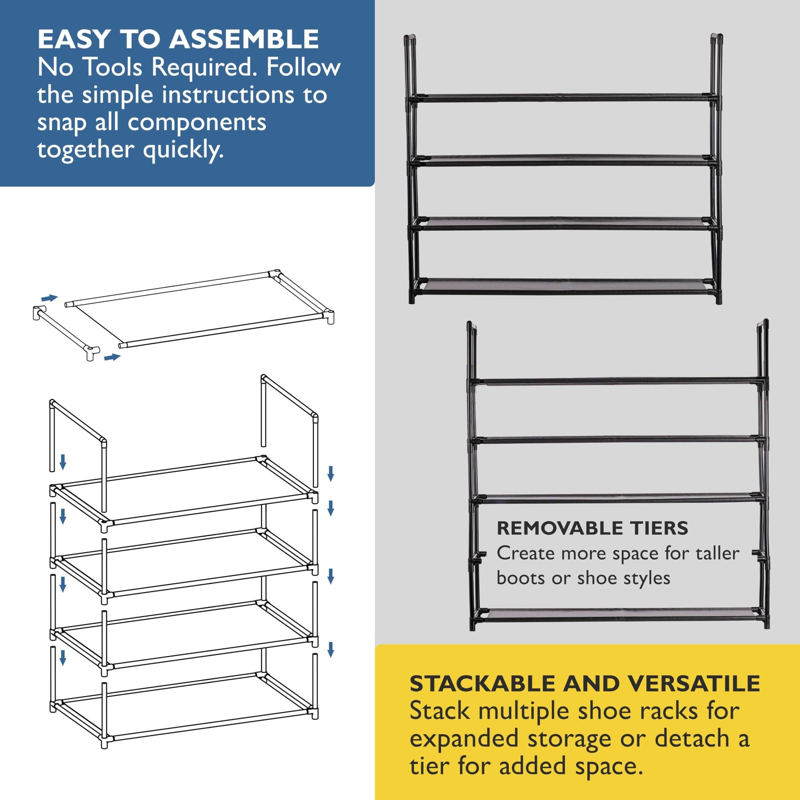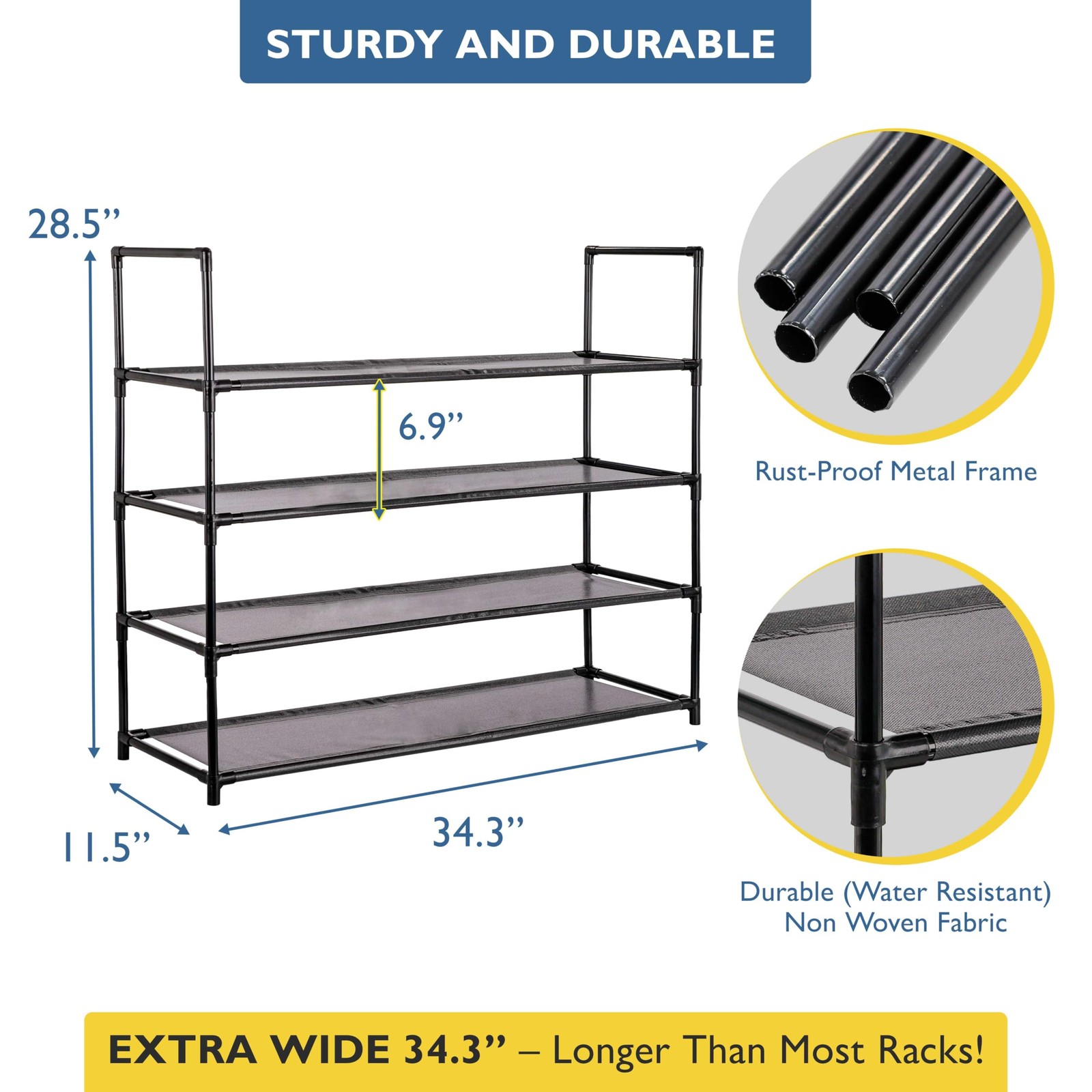Transform your home with the 4 Tier Shoe Rack, a versatile and sturdy shoe organizer for all your shoe storage needs. Designed to hold up to 20 pairs of shoes, this spacious organizer is perfect for entryways, closets, bedrooms, dorm rooms, and garages. The durable, rust-proof metal frame and strong non woven fabric shelves ensure long-lasting use, while the waterproof design protects your shoes from moisture. Customize your storage with ease by stacking multiple racks or detaching a tier to create additional space. Whether you need to organize heels, boots, sneakers, or sandals, this shoe rack accommodates all types of footwear for both men and women. Assembly is a breeze with no tools required. Simply follow the easy instructions to snap the components together. Complete your home organization with brand stylish and functional shoe racks and storage solutions. Large Shoe Rack Organizer: Extra-long 4 tier shoe shelf holds up to 20 pairs of shoes. Perfect shoe rack for closet, entryway, bedroom, or the garage. Dimensions: 34.3"L x 28.5"H x 11.5"D. Sturdy and Durable: This shoe stand is built with a rust-proof metal frame and durable non woven fabric. This shoe organizer rack is designed to withstand daily use. Stackable and Versatile: Stack multiple shoe racks for expanded storage or detach a tier for added space. Customizable closet shoe organizer for heels, boots, sneakers, and sandals for both men and women. Easy to Assemble: No Tools Required. Follow the simple instructions and video to snap together components quickly. Multi-Purpose Use: Declutter any room with this modern, free standing shoe rack. Fits perfectly in both open and tight spaces, enhancing your home's functionality. This shoes organizer is lightweight and easy to move.