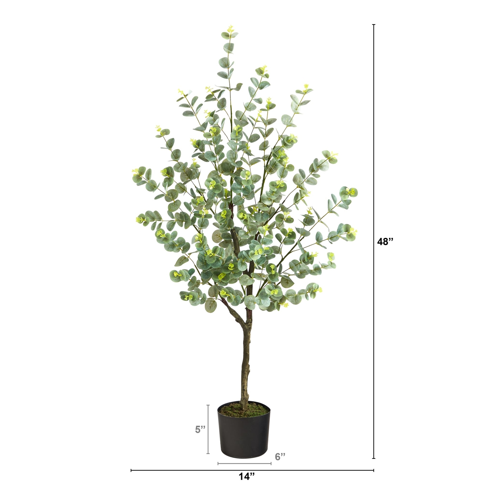 Bring home the essence of the healing Eucalyptus with this artificial plant. Different shades of variegated green leaves stem from a thick realistic looking brown trunk. Native to Australia, add an exotic touch to spaces that need texture and some color. Standing 4' from a nursery planter, included in height, curate in compact spaces such as apartments, dorms, and awkward corners of bathrooms. Designer tip: Many crafters decorate this plant in tandem with other herbs and mixed greens. Free Shipping Over $49.99* Details 4' Eucalyptus Artificial Tree - 6" Product Description: Bring home the essence of the healing Eucalyptus with this artificial plant. Different shades of variegated green leaves stem from a thick realistic looking brown trunk. Native to Australia, add an exotic touch to spaces that need texture and some color. Standing 4' from a nursery planter, included in height, curate in compact spaces such as apartments, dorms, and awkward corners of bathrooms. Designer tipMany crafters decorate this plant in tandem with other herbs and mixed greens.