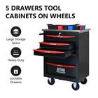 Features and Details: 5 Drawers mutifunctional tool cart with wheels. The tool box is also lockable and can be used as a removable, attachable and mobile case The opening and closing of the drawers of the tool cabinet is very gentle thanks to the ball-bearing drawers The robust and powder-coated steel construction is used for high wear resistance. This assembly trolley has 4 steering wheels, 2 of which with parking brakes, so you can move the trolley freely in the garage, but also stop in one place This is a set of cabinets, can use a round hook at the bottom of the table to connect another tool car, thus forming a combination. Specification: Color: Black+Red Material:Cold Rolled Steel Surface Finish :Powder Coating Casters:4" Casters (2PCS with brake and 2PCS without brake) Product Size (with wheels and countertops):22.28*13.58*30.71INCH Product Size (without wheels and countertops):20.63*12.99*25.16INCH Weight (lbs.): 52.03