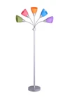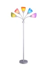 The 5-Head Silver Floor Lamp, model JK 1671-FL-SLV with multi-color pastel plastic shades, is perfect to use in kids bedroom, playroom, living room or office to add fun. Standing at a height of 67 inches, this freestanding floor lamp has a slender tubular body atop a round plastic base. It has five plastic cone shades attached to the top with flexible gooseneck arms to focus light where you need it, and a variable multi-head setting to allow versatile lighting options to illuminate all the lights or just a few at a time. It requires 5x60W or 9W LED bulbs (sold separately). Add this fun and vibrant 5-head floor lamp to your home for a unique look next to a sofa or a rm-chair to add versatile adjustable lighting to your living room, den, dorm, office, kids bedroom or playroom. This lamp is easy to maintain and easy to assemble. Adult use. Overall height 67" Classic Modern Styling Silver finish with multi-color plastic shades Teen or adult use Easy 4-way turn knob switch Sturdy metal base 5 plastic shades - multi color On Nov 16, 2024 at 04:35:08 PST, seller added the following information: