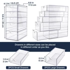 【Excellent Storage and Multi-Function】-- The desktop organizer measures approximately 4.1 "W x 6.8 "L x 9.8 "H / 10.5 x 17.5 x 25cm. The clear acrylic organizer is a fantastic way to add storage space and style to any room in your home. With its large capacity and stylish design, this storage box is sure to add a unique element to your home decor. (NOTE: The length of the drawer box is 6.8"/17.5cm, please first check the length of your item in case it won't fit. WARNING: Some pencils are too long to fit into.) 【Desktop Storage with 5 Drawers】-- Designed with 5 drawers, 2PCS LARGE drawers are 2.3"/6cm high, suitable for placing larger items such as markers, pens, scissors and other stationery. 3PCS small drawers are 1.5"/3cm high, perfect for smaller accessories such as paper clips, binders, thumbtacks, erasers, rulers and other small tools. Moreover, you can arrange each drawer from top to bottom in different order as you like. It's perfect for organizing all the messy items into categories, and it's very easy to access. You can also use them side by side and place small items on top of the acrylic storage bins to make your countertop space tidier. 【Half-moon Cutout Handle & Smooth Sliding Drawers】-- Each small drawer is designed with an ergonomic curved handle for easy pulling. The edges are smooth, rounded and won't scratch your hands. It will be a perfect way to maximize storage opportunities, no matter the space. Ideal for use as a desktop organizer with drawers, office supplies organizer, acrylic paint organizer, makeup drawer or hair accessories organizer. 【Acrylic Office Desk Organization & Storage】-- Our storage box is made of premium acrylic material, which has better aging resistance, higher hardness and durability. In addition, acrylic has a clear transparency that enhances the overall appearance of the storage box, becoming more visible and organized, while adding the perfect display to any room. 【Stack it up】-- The storage box is perfect for storing all your hair accessories and makeup. The sleek design will add style to your dressing table. Moreover, the drawers provide plenty of storage space, allowing you to store and organize your items with ease. To keep your desk looking tidy while keeping office scool supplies within easy reach. As your stationary collection expands, customize your display by stacking additional organizers from the Desktop Storage Drawers Series (5 drawers or 3 drawers).
