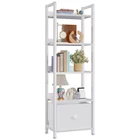 Shelf with Removable Fabric Drawer: This slender bookcase features a drawer with a fabric-covered surface, offering a light and soft touch. It can be paired with 2 to 4 tier shelves to customize your storage solution as needed. Space Efficient: This 5-shelf bookcase boasts a compact and lightweight design, taking up minimal floor space. Perfect for placing your favorite books, crafts, photo albums, and potted plants, it's a versatile storage and display option for your essentials and decorations. Multi-Purpose: The bookcase can serve multiple functions, such as a desk organizer, kitchen countertop organizer, display shelf, office bookshelf, plant stand, storage shelf, kitchen stand, and more. It's an excellent choice for decorating and organizing your living room, bedroom, home office, bathroom, kitchen, or entryway. Stable and Durable: Constructed from high-quality particleboard and a sturdy metal frame, this shelving unit includes a safety backboard, four adjustable feet, and anti-tip kits to ensure enhanced stability and durability. Each shelf can support up to 30 lbs, meeting your everyday storage needs. On Oct 26, 2024 at 01:47:10 PDT, seller added the following information: