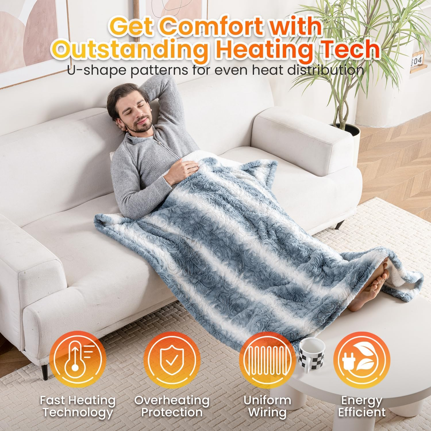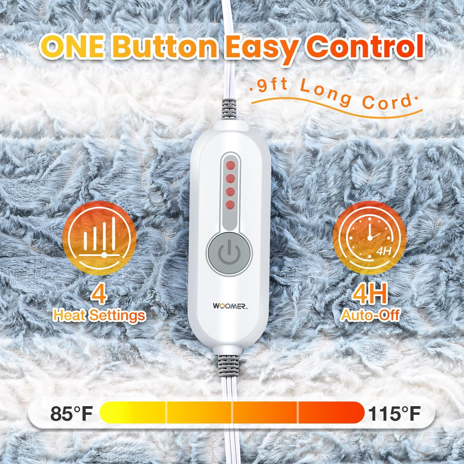 [Spring Blossom Collection with Flower Patterns] Elegant Faux Fur, with a plush Sherpa reverse, combines unmatched warmth with stylish home decor functionality. [Safety is Priority] 4-hour auto-off for secure sleep in chilly weather. Dual spiral wires ensure rapid warming and overheating protection. ETL certified for safe use. Plus, it's machine washable. [One Button Easy Control] One button controller and 4 heat gears make it easy to set your ideal temperature from 86°F to 113°F. User-friendly for most kinds of people. [Gift Box Design] This beautifully crafted gift box, adorned with chic floral patterns and charming decorative elements, makes it the perfect present for your loved ones during the chilly holiday season. [Hassle-Free Purchase] Enjoy reliable and warm after-sale service on our electric blanket, with assurances of prompt responses to all inquiries. Product Description The video showcases the product in use. The video guides you through product setup. The video compares multiple products. The video shows the product being unpacked. ONE Button 4 Heating Levels Easy to control and customize ideal temperature from 85°F-115°F 4H Auto-off Reservation Thoughtful 4H auto-off and overheat protection 1 Warm Pro 2 Advanced heating Tech 3 Machine Washable