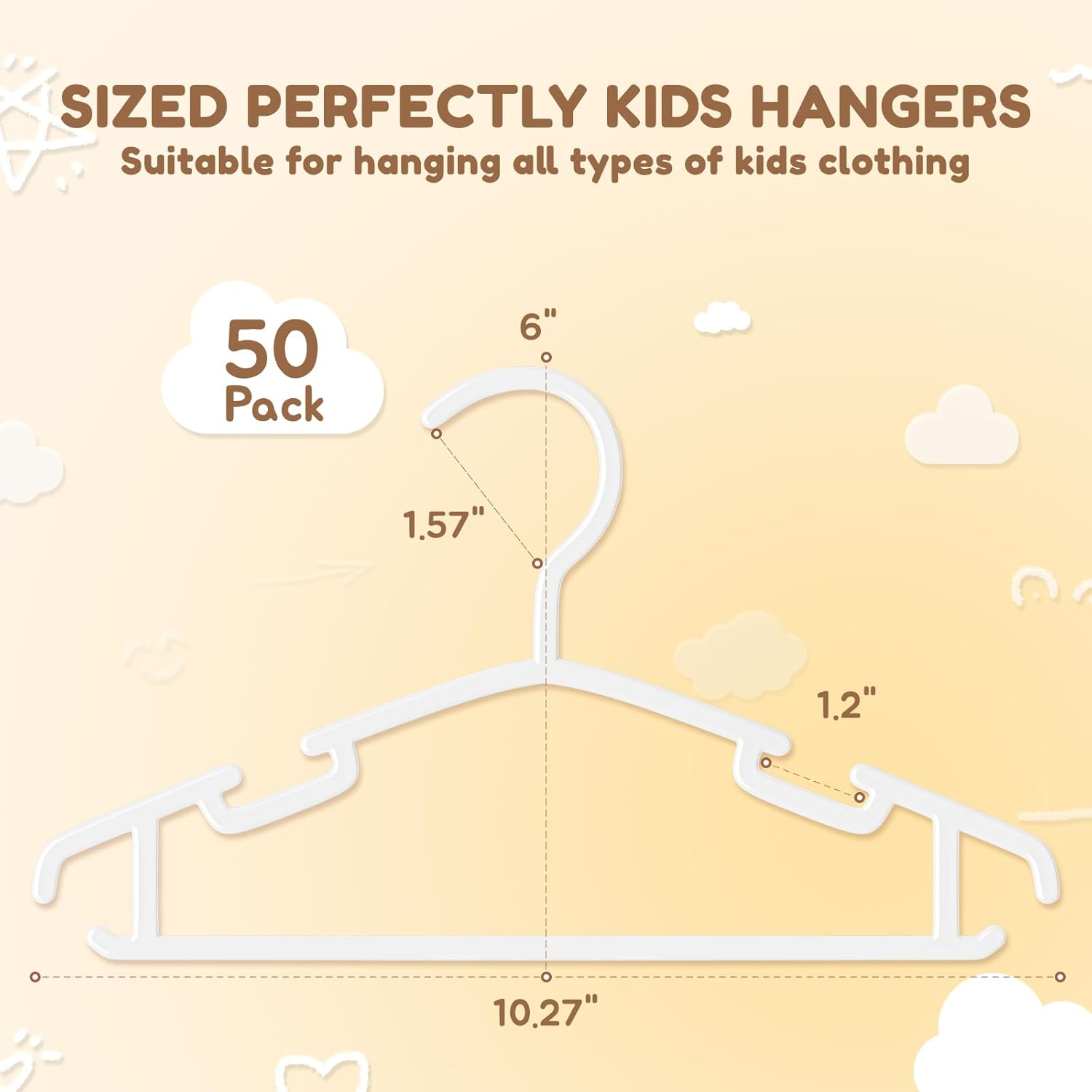 SIZED PERFECTLY BABY HANGERS: The size of these kids plastic hangers is 10.27 x 6 x 0.15 inch, which can hang kids clothes from newborn sizing to 5T (0-5 years old), perfectly fit the clothing of infant, baby, toddler, and kids. Hook size of the toddler hangers is 1.57", suitable for any closet rod. DURABLE BABY CLOTHES HANGERS: The children hangers are made from premium high-quality PP plastic, which can be used both wet and dry. Reinforced edges for long lasting use. Sturdy enough to hang various clothes from tiny baby clothes to bigger kids' outfits and sustain everyday use. WIDEN NOTCHED GROOVE: The baby plastic hangers designed with built-in shoulder grooves, to prevent the kids clothes from slipping or falling off the hangers. You can hang children's halter skirts, vests, women camisole, tank top, lace pajamas and other fashion accessories on the shoulder grooves of these baby hangers. SPACE-SAVING DESIGN: With their slim profile, these hangers help optimize closet space, allowing you to fit more clothes while keeping everything organized and easily accessible. It's nice to get child clothes hung up and not have to worry about trying to fold or keep the clothes from being messy in a drawer. PROTECT BABY CLOTHES: The smooth surface of these hangers ensures that delicate fabrics, such as baby onesies and tiny dresses, are protected from snags or stretching. Plus, smooth surface makes it easy to hang and remove clothes, which is a huge plus when you're trying to get your little ones dressed in a hurry. Body curve design on both sides, clothing will not be deformed. Product Description VILICK KIDS PLASTIC HANGERS - DURABLE, SPACE SAVING AND FUNCTIONAL If you are a parent or a caregiver, you know how important it is to have the right hangers for your little ones' clothes. EXTRA DURABLE kids aren't always gentle with their belongings, so it's important to have hangers that can withstand some wear and tear. These hangers are sturdy and strong enough for daily use. and won't bend or break with some of the heavier clothes. PERFECT SIZE Sizes 10.2in x 6in, make it perfect for all types of kids' clothing, from tiny baby clothes to bigger kids' outfits. (Suitable for age within 5 years old) Perfect size and shoulder curve allow you to hang your baby's clothes without worrying about any bump and crease. SPACE SAVING Ultra thin design makes our kids hanger very useful as a space saver in small closets. They are great for displaying all of your child’s favorite outfits, whether you hang them out to air or in a wardrobe. Non-slip Kids Hangers Widen Notched Groove Extra Durable for Long-lasting Perfect Plastic Kids Hangers for Closet and Baby Clothes Organizing