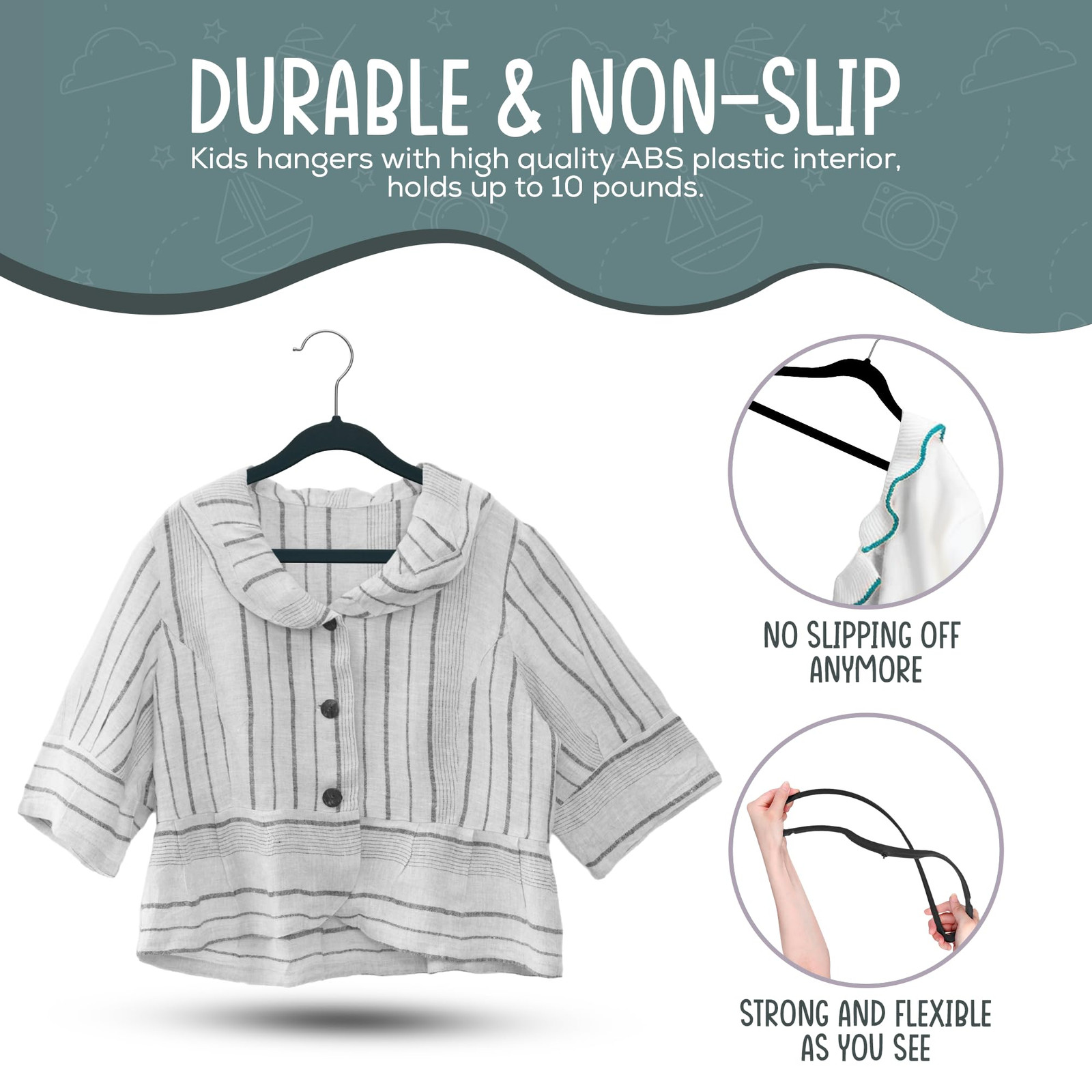 PREMIUM QUALITY SLIM BABY HANGERS : Protect delicate baby clothes with slim 14” kids velvet hangers 50 pack - gentle, lint-free, notched shoulders prevent slipping and maintain perfect finish. STRONG AND DURABLE : Baby hangers with high quality ABS plastic interior, hold up to 10 pounds. 360° swivel hook, keep clothes organized and save space. MAXIMIZE CLOSET SPACE : Maximize closet space with our ultra slim baby hangers, measuring 14" in length 0.20” in width and 8” in height, makes them a perfect size for baby clothes. These hangers are slim enough to maximize closet space, yet strong enough to hold up heavy clothing items. VERSATILE VELVET HANGERS : Organize with ease using 50 velvet baby hangers. Ideal for kid's clothing, jackets, pants, shirts, dresses, underwear, camisoles, nightgowns, or pet clothing, making it a versatile closet essential. MAKES A GREAT GIFT : Make a thoughtful gift with this pack of 50 baby hangers with chrome finish. You can replace all your regular hangers at once. Perfect for dresses, suits, shirts, skirts, trousers and more.