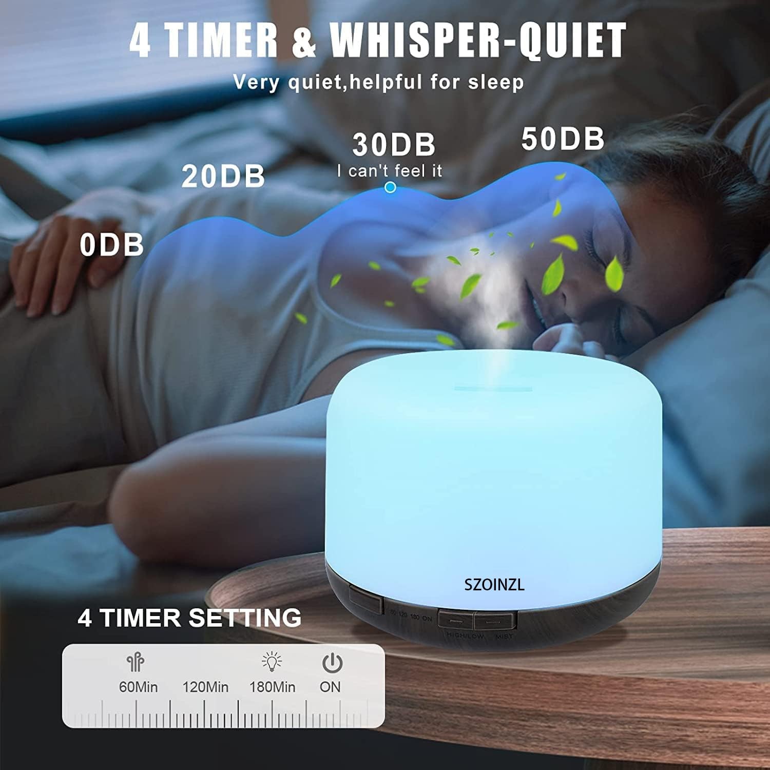 Specification: Power: AC100-240V 50/60HZ/DC 24V 650MA Cable length: 150cm Power consumption: 13W Timers: 60 m/120 m/180 m/ON Watertank: 500ML Light:7 colors Materials:PP Weight: 500g Package Includes: 1 x Diffuser 1 x Power Adapter 1 x Remote Control 1 x User Manual 【500ML & BPA Free】:the watertank is 500ml which can work for 8-10 hours . The essential oil diffuser was made of PP material. 【7-Color Lights】:Light can be set to 7 soft and relaxing colors.long press the LIGHT button for 2 seconds to turn off the light. 【4 Timers】:short press MIST button to choose between 60 min, 120 min, 180 min, ON and OFF, you can also use the remote control to control the essential oil diffuser. 【Auto Off 】:The essential oil diffuser automatically turns off when time runs out or when there is no water. 【Remote Control】:it is easy to control the essential oil diffuser via the remote control (please remove the insulation sheet on the remote battery before use).