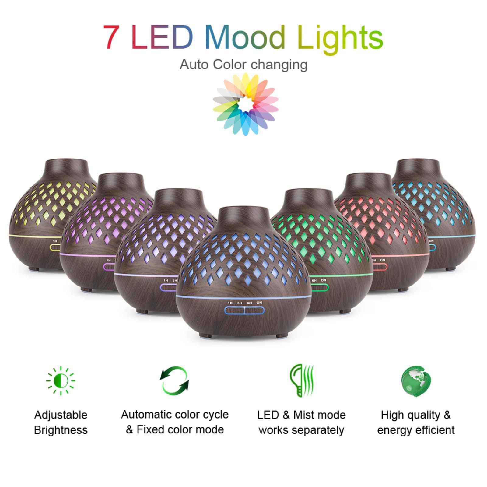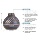Essential Oil Diffuser 【 ESSENTIAL OILS DIFFUSER SET 】 The essential oil diffuser with remote control and 7 LED light colors. Add a few drops of your favorite essential oils to create an aromatic home spa. Perfect for home, office, yoga, a beautiful gift for friends, family or loved ones. 【 MULTI-FUNCTIONAL AROMATHERAPY DEVICE 】 This ultrasonic essential oil diffuser is an amazing multi-functional aromatherapy device unlike any other you've ever used. It features a large and easy to clean 500ml water tank, 7 LED light colors, multiple mist nebulizer modes and remote control, as well as a safety auto-switch that prevents it from overheating in case it runs out of water. 【 CONVENIENT REMOTE CONTROL 】 Our diffuser comes with an easy to use remote control that can control it from up to 16.5-feet and change the lighting and misting modes as well as set the humidifier's timer. 7 Fun light colors can be fixed or cycled through. The diffuser has 1/3/6 hour timer mode and continuous ON mode. You can also set intermittent mist via the remote control. 【 10H LONG WORKING TIME & WHISPER OPERATION 】 This Fragrance essential Oil Diffuser comes with 4 built-in timer setting modes: 1/3/6 Hours/ Continuity. You only need pour enough water and drops essential oils to enjoy the taste of nature. With the upgraded ultra-quiet fan, the diffuser is quieter than ever. The noise level is lower than 23 dB, which is quieter than gentle sound of breathing. 【 SAFETY GUARANTEE 】 BPA-free, waterless automatic shut-off function and almost silent work to help you sleep well, safe enough to use. Whether you use it during work, meditation, or sleep, the diffuser quietly releases soothing scents and creates a tranquil environment without causing any disturbances.