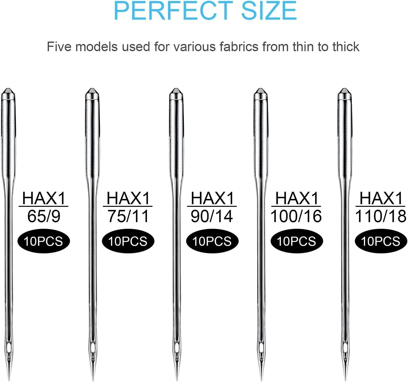 Sewing Machine Needles, 50 PCS Universal Sewing Machine Needle, Compatible with Singer, Brother, Janome, Varmax, Sizes HAX1 65/9, 75/11, 90/14, 100/16, 110/18 (50 PCS) - PREMIUM QUALITY MATERIAL: Made of top quality high-strength steel, sharp smooth, sturdy and durable, not easy to bend, and long service life. - VALUE PACK & PERFECT SIZE:This set come with five sizes: 65/9, 75/11, 90/14, 100/16, 110/18, 10 needles per size, total 50 needles. Also includes 5 storage tubes (free) and 3 bobbins (free). - PERFECT COMPATIBILITY: They are compatible with most household sewing machines or old sewing machines, such as Singer, Brother, Janome, Varmax, etc. Notice! Not suitable for industrial large sewing machines. - ENJOY THE FUN OF DIY: Perfect for thin fabrics such as yarn(size: 65/9), medium-thin fabrics such as shirts, satin (size: 75/11), ordinary fabrics such as windbreakers(size: 90/14), thick fabrics such as jeans(size: 100/16), thicker fabrics such as thick coats(size: 110/18) . - INTIMATE GIFT: The set is an amazing gift for your relatives, friends, families, mother and wife. ***OUR POLICIES: Shipping: FREE SHIPPING. Absolutely Safe! EVERY PACKAGE HAVE TRACKING NUMBER , It will take 3-5 working days from shipment date. All product will be tested in 100% before delivery.If the item is defected by the processing of postage. We attach great importance to your satisfaction. PLS feel free to contact us if anything happens and makes you feel unsatisfied. We ensure you that we will do what we can to solve any problem. Thank you for your watching! Feel free contact me if you have any questions.