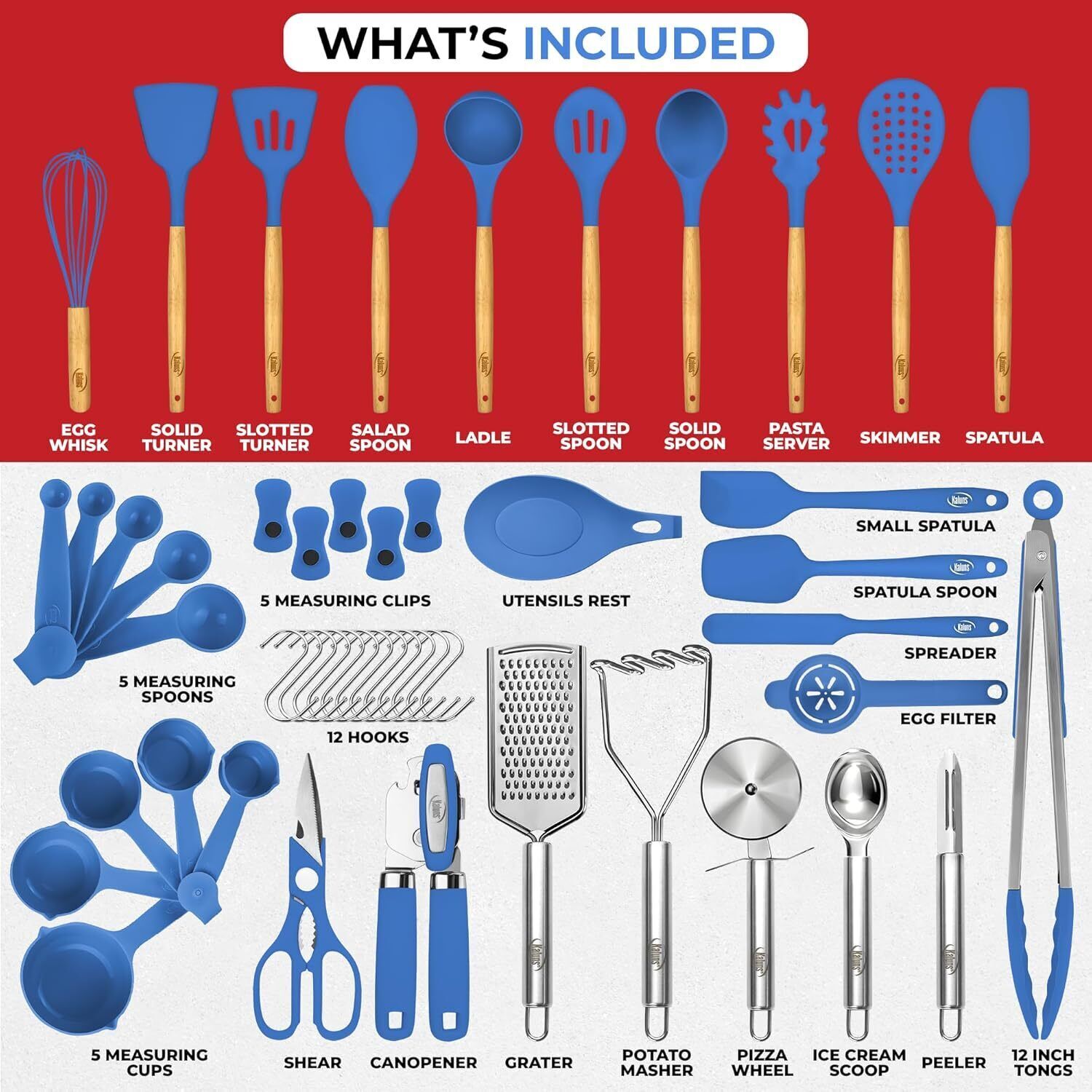 Size small Is Dishwasher Safe Yes About this item Complete 50Pcs Set: The Kaluns utensil set includes everything you need for a complete cooking experience. You’ll receive: slotted turner, ladle, salad spoon, solid turner, solid spoon, pasta server, slotted spoon, skimmer, spatula, utensil rest, can opener, egg separator, small spatula, spatula spoon, kitchen shears, 12” tongs, 12 x kitchen hooks, 5 x measuring cups, 5 x chip clips and 5 x measuring spoons, can opener, grater, pizza cutter, veggie peeler, ice cream scoop, a total of 50 pieces! Safe and Durable Materials: Our cooking utensils set is made employing premium grade, highly durable materials, a combination of non-BPA silicone, stainless steel and wood, with smooth finishes and with no unwanted paints or nasty smells that transfer to your delicious foods Heat Resistant and Perfect for Your Cookware: Unlike similar products on the market, this silicone spatula set is easy to clean and doesn’t stick, withstanding temperatures of up to 480℉ without melting or damaging your premium pans and pots. Perfect Gift for Loved Ones: Order these spatulas for kitchen use for yourself or as an original gift idea for a friend or loved one, and you can be sure to win their appreciation! An excellent choice for cooking enthusiasts, housewarming gift, wedding registry gift and other special occasions, this set comes in an elegant ready to gift box, for your convenience. The Possibilities Are Endless: These silicone utensils for nonstick cookware are incredibly versatile and will come in handy for a wide range of cooking activities, allowing you to surprise close ones with delicious home-cooked courses, desserts and more! Size small Is Dishwasher Safe Yes Handle Material Wood Material Type Free Plastic Free, Latex Free, Lead Free, BPA Free, PVC Free Recommended Uses For Product Serving, Flipping, Mixing, Cooking Manufacturer Kaluns UPC 850014784539 Global Trade Identification Number 00850014784539 Package Dimensions 13.94 x 7.99 x 4.88 inches Item Weight 4.8 pounds
