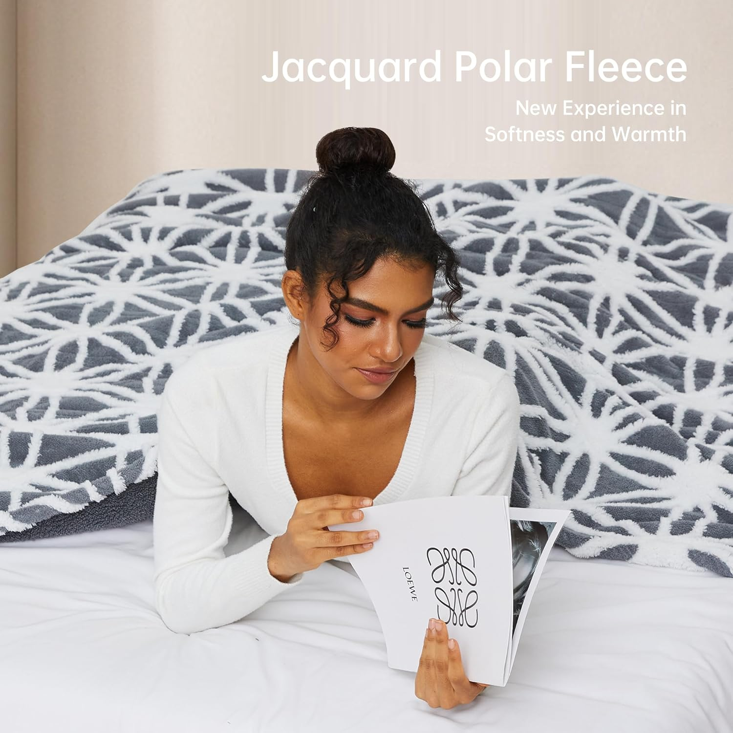 【Experience the cozy embrace of home】Jacquard Polar Fleece, a blend of elegance and warmth. Its soft, plush texture in soothing hues like Grey adds a touch of cozy to your living space, creating a sanctuary for you and your loved ones. 【Designed for versatility】Our 50"x60" blanket boasts a compact and portable form factor, ideal for indoor lounging, office breaks, or cozy travel companionship. Its flexibility ensures warmth follows you wherever life takes you. 【One-button control system】5 Heating Levels to cater to individual preferences. Coupled with robust safety features, it ensures a comfortable and secure warmth experience. 【3 hour auto-off feature】Incorporating advanced overheating protection and a 3 hour auto-off feature, our blanket safeguards against potential hazards, ensuring a peaceful night's sleep or a worry-free day. 【Designed for hassle-free upkeep】Make sure your warm companion stays fresh and comfortable with a simple machine wash. With just a little attention, it will continue to bring you comfort. Product Description
