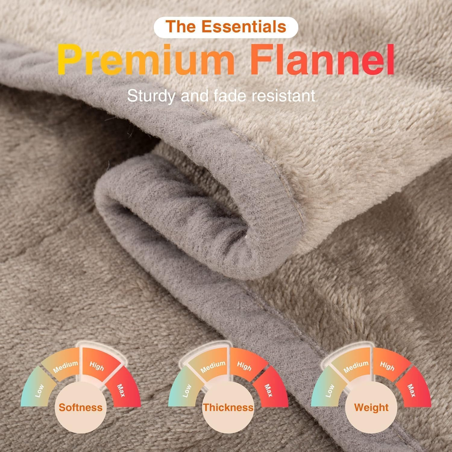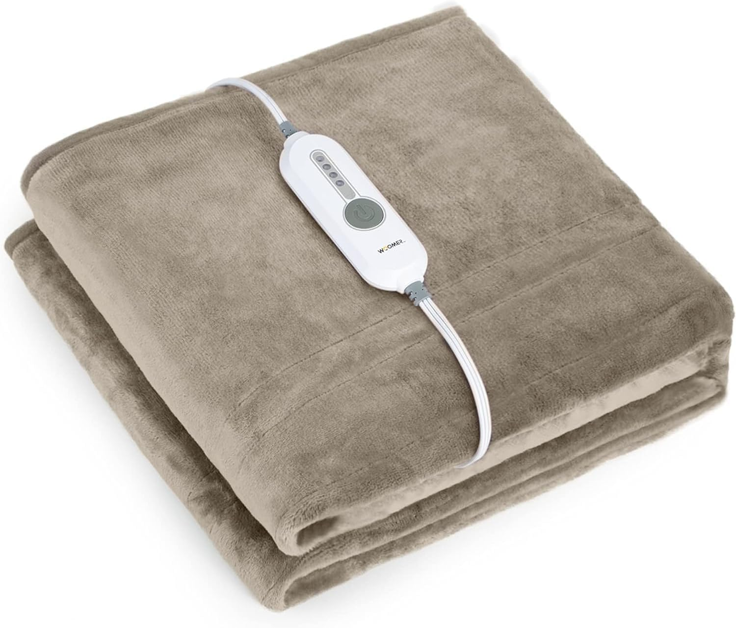 Flannel [Premium Bedding Fabrics]The heated blanket is made of flannel & sherpa that is comparatively thin and breathable (4mm short fur); Feel smooth and soft on the skin to bring you maximum coziness; Machine washable under 40°C to maintain its best condition. [Customized Settings]Use the controller to easily switch between 10 heat levels from 86℉ to113℉. Set from 0.5h to 12h Auto-Off (0.5/1h increments) to reserve the length of your heating time; This heating blanket is equipped with a 19-feet extra-long cord to offer maximum flexibility and convenience. [Superior Heating Technology]This 50"x 60" throw size electric blanket has built-in heating wires that are placed in U-shape patterns for even heat distribution to ensure exceeding comfort and coziness; The fast heating technology offers you instant and even warmth on cold days. [Safety Protection] ETL certified; Woomer heating blanket is specially-designed with over-heating protection to avoid accidents; The Auto-off timer allows you to sleep securely without any considerations in chilling weather. [Comprehensive Customer Service]We offer you 30-day return or exchange for our electric throw blankets , and all messages will be replied within 24 hours. Product Description One Button Easy Control Use the controller to easily switch between the 10 heat levels from 86℉ to113℉ and set 0.5h -12h auto-off reservation. Fast Heat & Energy-Saving Adopts upgraded double layer heating wires to ensure efficient safe, fast and even heating. Long Cord 9ft long power cord allows you to conveniently reach power outlets anywhere in the room. Reliable and Caring We promise 5-year repair or exchange on our products plus 30-day return for the most comprehensive service. 1 Warm Plus 2 Giftable 3 Machine Washable