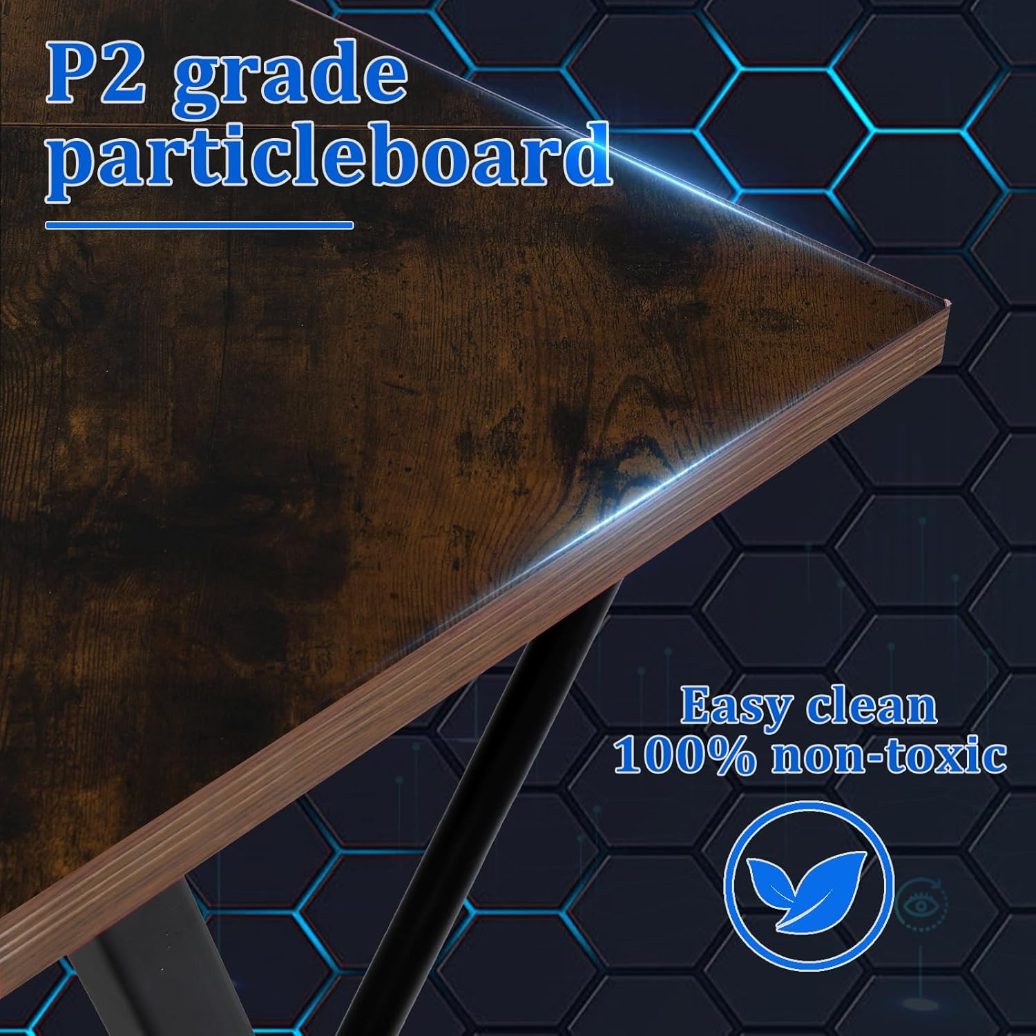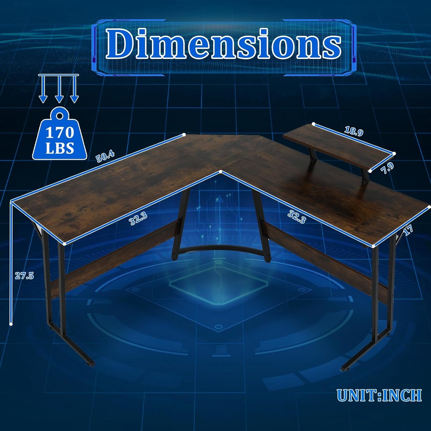 【Detachable Monitor Stand】The gamer desk comes with an adjustable monitor stand.Suspension display stand design will let your spine feel more relax when you looking at the monitor ,and the adjustable design allows you to easily and casually adjust it to your needs. This gaming table bring extra storage space could gives you more room on your desktop. Such an ultimate comfortable experience with this gamer desk will surely be the reason for you to choose this gamer desk! 【L shape design】Gaming desk l shape allows you to easily place the table in any corner of the house.The L-shaped design distinguishes itself from the traditional rectangular table, allowing you to increase the space you use while keeping the footprint the same. You can work on the left and play on the right, so when you have an L-shaped table, you have two worlds in one! 【Safe and Robust Material】The table top of this work desk is made of 15mm particle board, which is not only durable but also non-toxic and harmless material to make you feel more at ease in the process of using. The desk table top and legs as a whole form a Z shape, and the corners and brackets form a triangle that is not easy to deform, so many details are designed to make this l desk have a better load bearing capacity and you will not shake in the process of using it! 【Best for gaming】The carbon fibre desktop of gaming table makes the desktop smoother and doesn't make mouse operation jerky. In addition, Carbon Fibre Desktop is waterproof and easy to clean. The wide legroom under the computer Desk and the bottom Baffle design will stimulate your gaming passion! 【Easy to assemble】Every customer who purchases an item receives a detailed installation instruction of the desks for bedrooms , and we have numbered each part to make it easy and quick to put this computer Desk together by following the instructions in the included installation instructions! Product Description What is the material of the table? Engineered Wood. How much weight can the desktop bear? The maximum weight of the table top is 80 kg. What is the size of the game table? Product dimensions 50.4 "D x 50.4" W x 27.5 "H (L-shaped).