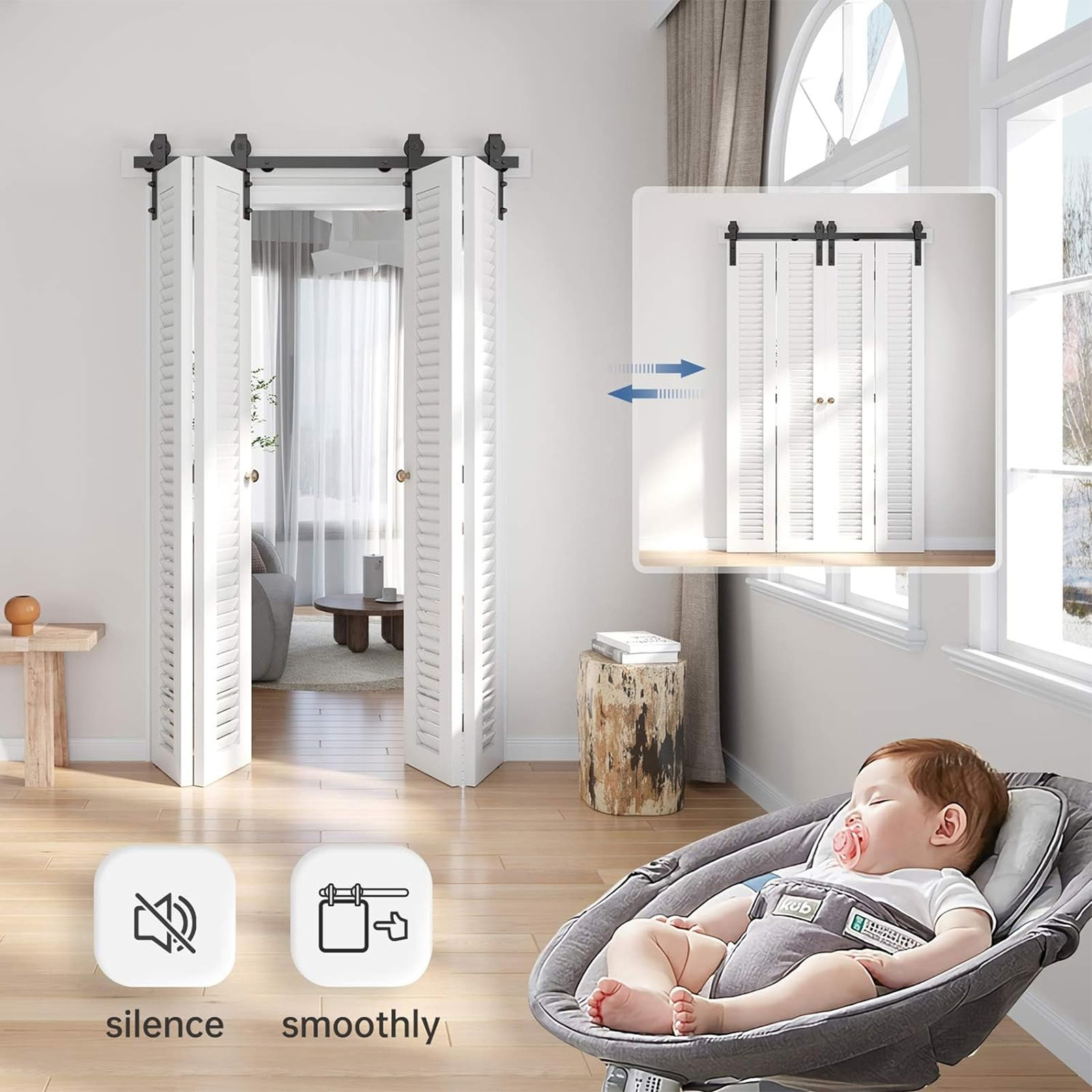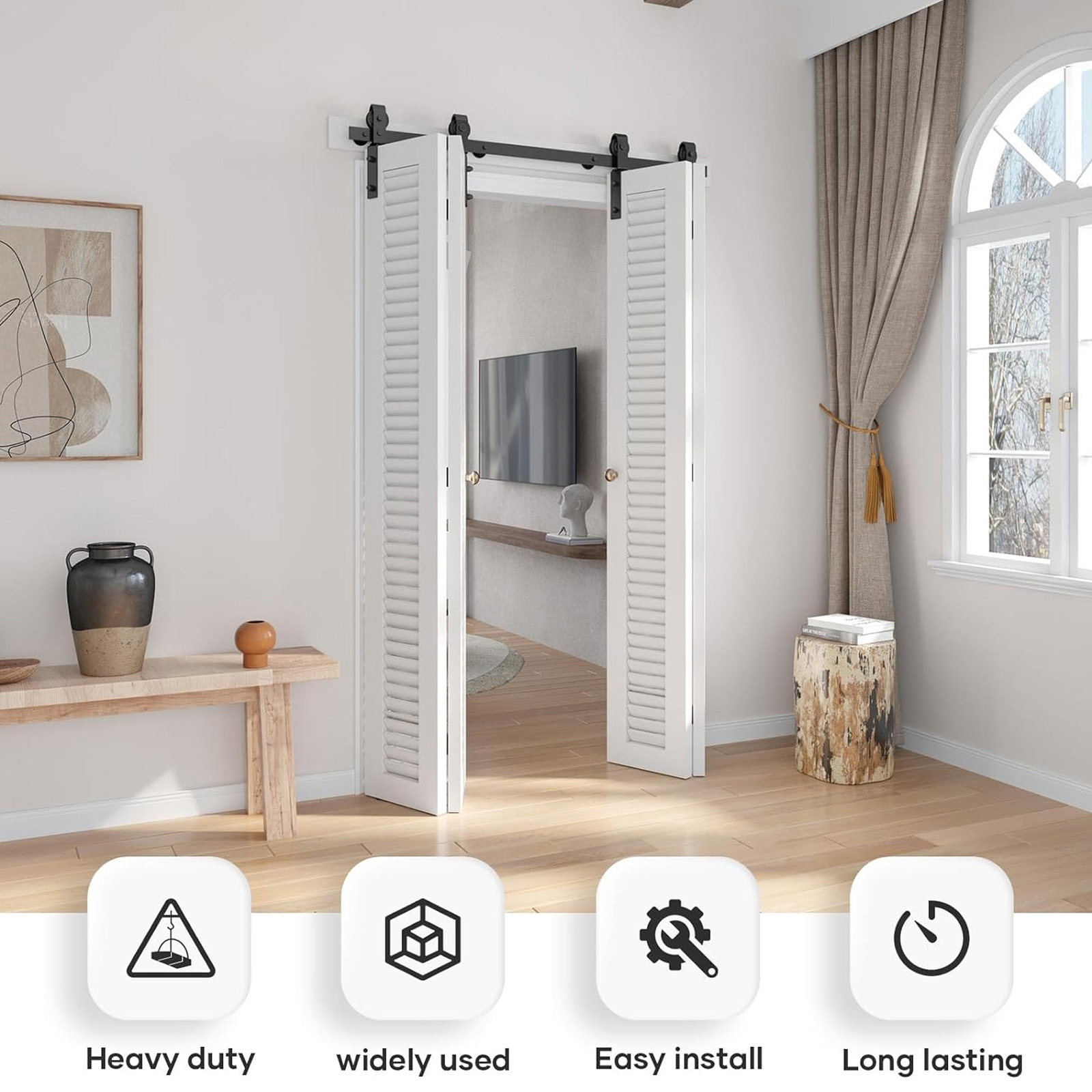This sliding barn door hardware kit is a game-changer! The carbon steel construction feels super sturdy, and the rollers glide smoothly for whisper-quiet operation. Installation was a breeze, and now my folding doors save so much space while looking stylish. The anti-rust coating gives me peace of mind—no more worrying about wear and tear. Such a sleek upgrade for any room!