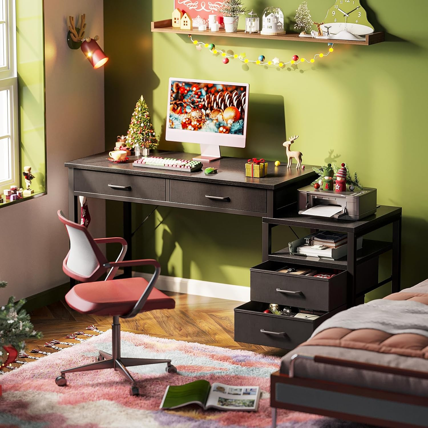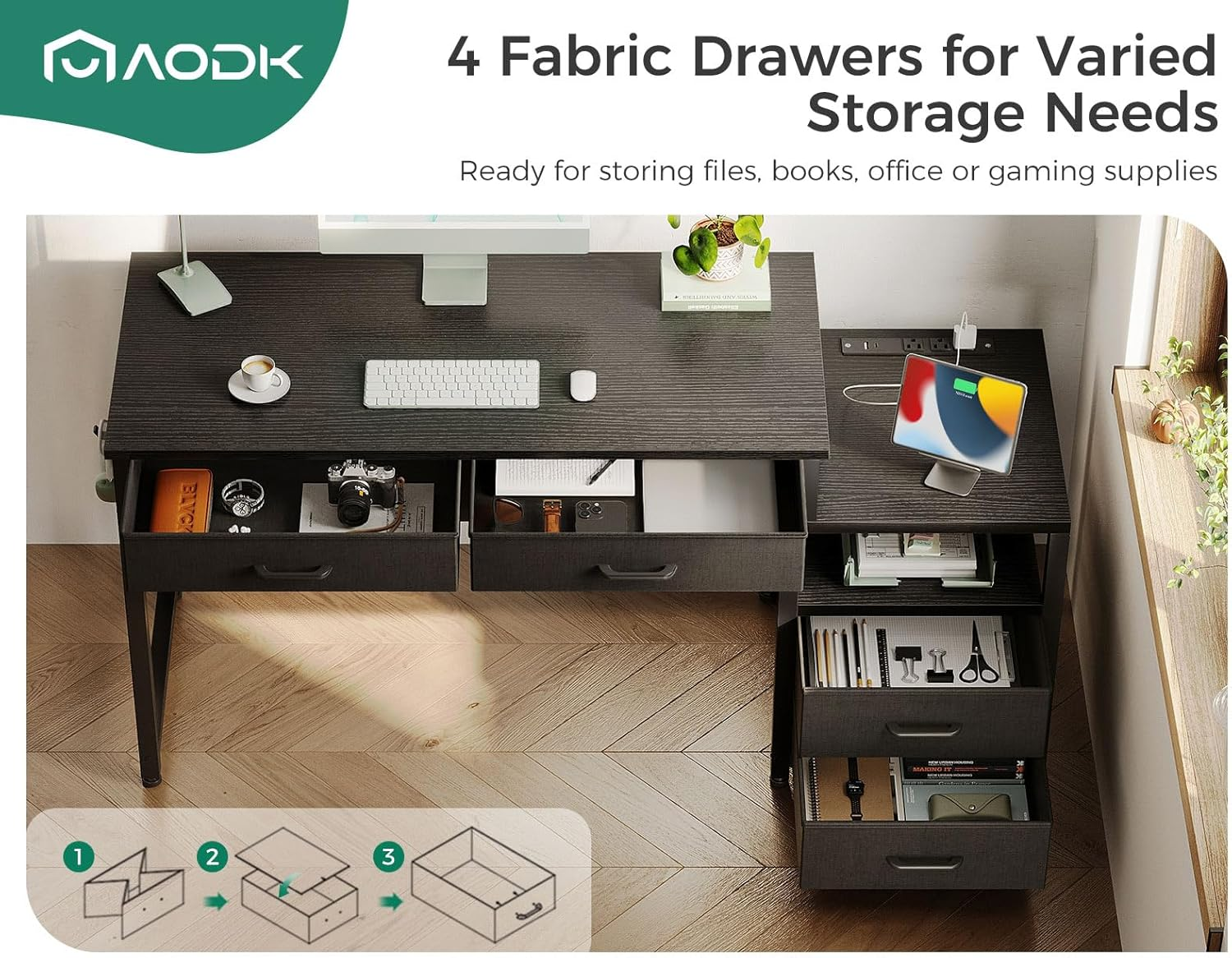 【Large Storage Space- 4 Drawers】The home office desk has four drawers made of fabric. Storage drawers are ready to use and easy to clean, offering a private space for organizing your goods. The drawer chest top can hold small printers, small scanners, small fax machines, PS5, computer tower etc., keeping them within easy reach of your desk to free up work space. 【USB Charging Ports & Power Outlets】The PC desk features a 6.6-foot built-in power strip with 2 USB ports and 3 AC outlets in the drawer chest top. So you can conveniently charge your computer, printer, smart phone, headphone, gaming gear and Bluetooth devices when you are working or playing games. 【Reversible Desk with Printer Stand】The simple desk measures 53"(L) x 18.9"(W) x 30.4"(H), desk top is 40"(L). The printer stand can hold a 15.2"(L) x 13.4"(W) printer. In order to fit to the space and habits of different users, the corner desk is designed in two installation forms - The drawer chest can be installed on the left or right side of the main desk. So you can customize the desk that works best for you. 【Sturdy Constructions & Iron Hook】The working desk is constructed by premium metal frame & high-quality MDF board to ensure stability and durability, which is scratch and water resistant. A versatile hook provides additional storage space for your convenience. Adjustable non-slip foot pads not only protect your floor from being scratched, but also ensure stability on uneven ground. 【Easy Assembly & After-sale Service】AODK desk comes with detailed instructions, all parts are clearly labeled, what you need to do is following instructions step-by-step. If your AODK desk arrives damaged, missing parts or scratched, please feel free to contact us, our professional customer support team will help you solve the problem within 24 hours. Product Description