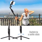 Features: 【Selfie Stick & Mini Tripod 2-in-1】 To own this extendable selfie stick + detachable mini tripod kit, you not only can take selfies with great flexibility, but also can take pictures/record videos with excellent stability while liberating your hands. Perfect for selfies, group photos, vlogging, podcasts, live video, online chatting, etc. 【54-inch Fully Extendable Selfie Stick】 The selfie stick can be fully extended to max. 54 inch with the mini tripod, which enables you to get a wider shooting range and capture more smiling faces and more beautiful scenery. Telescopic and portable design makes it suitable for travel, sports activities, camping, family gatherings and so on. 【Sturdy Mini Desktop Tripod】 Made of sturdy aluminum alloy material, plus non-skid rubber feet, the mini tripod offers great safety and reliability for your devices. Folded length is only 18.5cm, which makes it more convenient to carry around. 【Wide Compatibility】 Universal 1/4 inch screw design, and comes with a phone holder and a sports camera mount adapter, the selfie stick tripod is compatible with digital camera, mirrorless camera, action camera and most smartphones. 【Wireless Remote Shutter for Smartphone】 The remote shutter is compatible with iOS and Android smartphones. Do not need APP, instantly wireless BT connection, easy to operate and free your hands to catch memorable moments in your life. Specifications: Material: Aluminum Alloy Selfie Stick Length: 42cm-120cm/16.5inch-47inch Tripod Folded Length: 18.5cm/7.3in Connector: 1/4 inch screw Remote Shutter Power Supply: 1 * CR2032 battery(included) Packing List: D8398 1 * Selfie Stick 1 * Mini Tripod 1 * Remote Shutter 1 * Phone Holder 1 * Sports Camera Mount Adapter Hello,welcome to the store,what can I help you?
