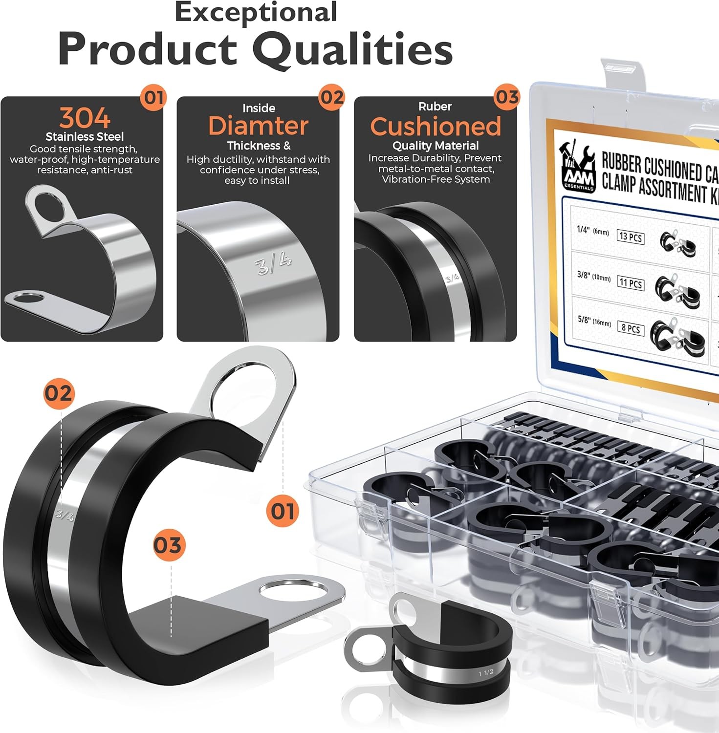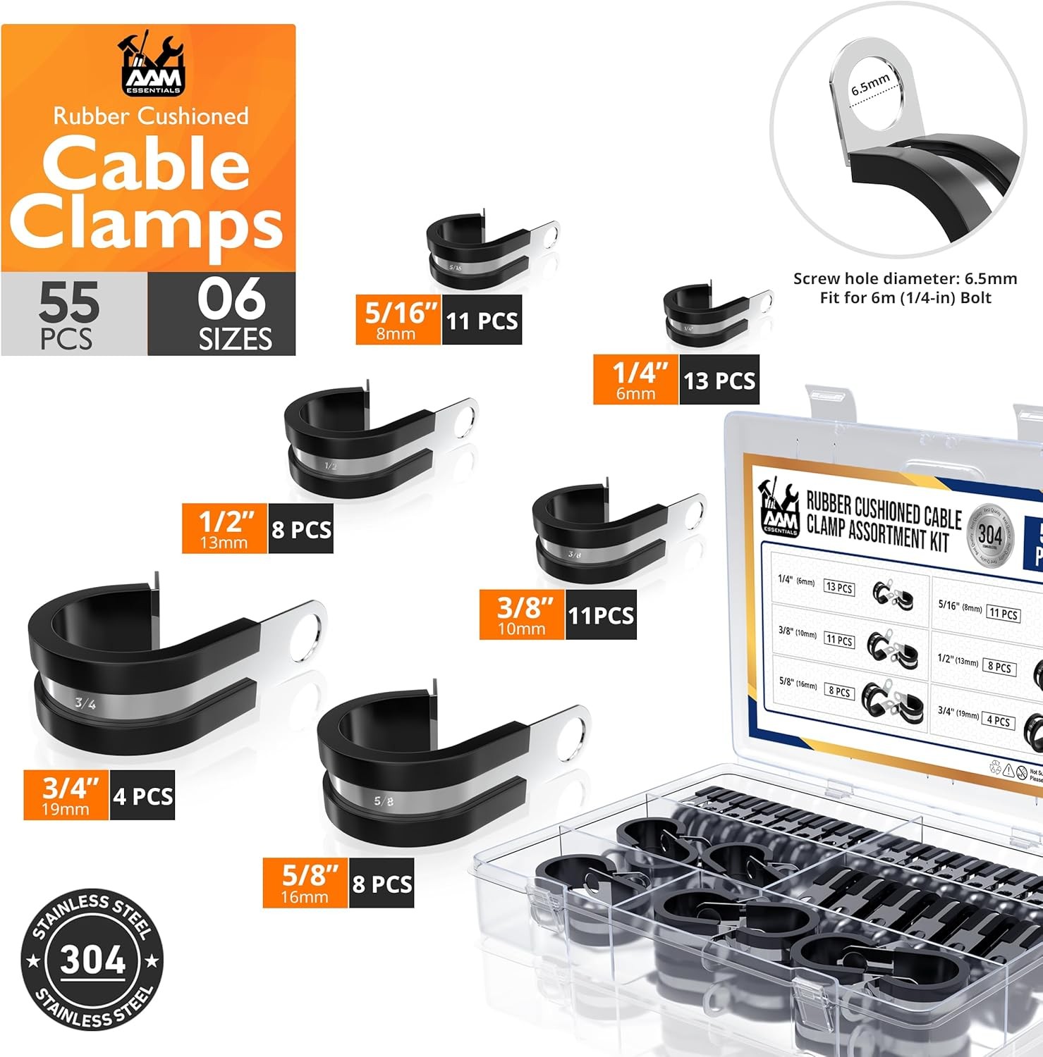 55 pcs cable clamps-304 Stainless Steel-Rubber Cushion Wire clamps-6 sizes 1/4" 5/16" 3/8" 1/2" 5/8" 3/4"-Assortment kit for pipe & wire mounting. Product Details Manufacturer: AAM ESSENTIALS Item Weight: 1.01 pounds Package Dimensions: 9.65 x 7.91 x 1.54 inches Country of Origin: China Item model number: CC_55PCS Material: Stainless Steel Item Package Quantity: 55 Included Components: Clamps Batteries Included?: No Batteries Required?: No Material: Stainless Steel Brand: AAM ESSENTIALS Tensile Strength: 1000 PSI Manufacturer: AAM ESSENTIALS Corrosion Resistance: 304 stainless steel cable clamp that Stands up to rust and moisture for outdoor applications. Easy to adjust or modify the clamps to fit specific needs without compromising the strength. Bright, polished surface gives aesthetic appeal over the time. All Sizes+3 Extras: We understand the need. Rubber clamp assortment kit include 6 size options (12pcs) 1/4”- (10pcs) 5/16"-(10pcs) 3/8"-(8pcs) 1/2”- (8pcs) 5/8"-(4pcs) 3/4"- Total count 52pcs + 3pcs extra Non-Slip Grip: The rubber lining of wire cable clamps provides a secure hold even while under heat or pressure variations. This provides extra safety helps in reducing noise caused by vibration. Rubber cushion prevents direct contact between clamp & wire provide protective insulation. Fast Clamping: Installing a wire clamps for cables is quick & effortless. Simply set the clamp, align the holes, secure with screws. This basic setup saves both time and effort. Concise portable box with size detail chart provides greater convenience. Heavy-Duty-Clamps: Automotive, HVAC, plumbing, electrical, marine, and industrial applications all benefit from its wide usage. These Rubber clamps are essential for organizing and supporting systems. Durable solution for both residential and commercial needs.