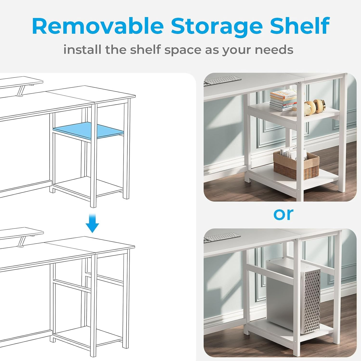 BUILT-IN MONITOR STAND: The stand size is 18.89*7.87 inches that can place a computer montior and for you to mantain a comfortable sitting posture. Moreover,free up more desktop space to place laptop,earphone, keyboards and daily necessities. REVERSIBLE STORAGE SHELVES: Computer desk with 2-tier storage shelves can be installed on left or right side according to your space or use habits.Open shelves can hold your books,storage box etc.You can remove the middle shelf to get more space for large computer tower STURDY STRUCTURE: Constructed by 40mm premium metal frame and thick particleboard,the home office desk is absolutely stable and sturdy,ensuring you enjoy your work on this desk.Modern Simple black desk can match any style of space COMPUTER DESK SIZE: 55 x 23.6 x 29.52 inch(L*W*H).The 31.49 inch width under the desktop provides plenty of leg room for movement,it is the best chocie as for work desk,writing desk,study desk, gaming desk. EASY ASSEMBLY: The white computer desk with shelves come with necessary tools and instructions,all parts are clearly labeled,just following instructions step-by-step.Only 30 mins needed Product Description Computer Desk with Monitor Stand and Ample Storage Shelves Use Two Modern Computer Desk to Make a Long Workstations 1 Reversible 2 Storage Shelves Monitor Stand to Save Desk Space and Freely Switch Around for Whatever You Need Create a L-Shaped Home Office Desk Suitable For More Different Scenarios And Needs The video showcases the product in use. The video guides you through product setup. The video compares multiple products. The video shows the product being unpacked. More Items in Our Store Add to Cart Add to Cart Add to Cart Add to Cart Add to Cart Add to Cart Customer Reviews 4.4 out of 5 stars 716 4.3 out of 5 stars 413 4.3 out of 5 stars 152 4.5 out of 5 stars 45 4.2 out of 5 stars 117 4.2 out of 5 stars 59 4.2 out of 5 stars 68 Price $109.99 $ 109 . 99 $89.99 $ 89 . 99 $99.99 $ 99 . 99 $99.99 $ 99 . 99 $79.99 $ 79 . 99 $109.99 $ 109 . 99 — GreenForest ✔ ✔ ✔ ✔ ✔ ✔ ✔ Functions Outlet,Reversible, Adjustment Mobile, Storage Outlet,Reversible, Adjustment Drawer, LED Lights Drawer,Led Lights Drawer,Led Lights Drawer, Printer Shelf Product Size(inch) 47L x 19.6W x 29.5H 31.5"D x 19.7"W x 29.5"H Outlet,Reversible, Adjustment 18.9"D x 50.4"W x 29.5"H 18.9"D x 47.2"W x 29.4"H 18.8"D x 50.3"W x 29.5"H 18.8D x 70.0W x 29.5H Multiple Color Black, Walnut, White Pure White, Black, Oak, White Black, Walnut, White Black, White Black, White Black, White Black, Walnut Multiple Size ✔ ✔ ✘ ✔ ✔ ✘ ✘