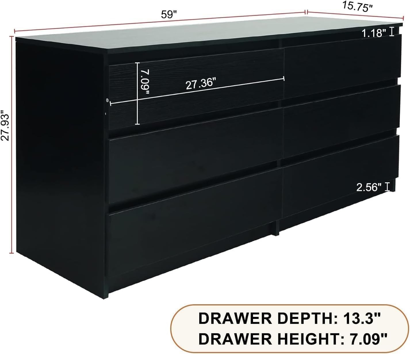 Product Description About this item 【Black Dresser】This 6 drawer dresser features a modern, minimalist design with a touch of sophistication. The clean wood panel finish, combined with its sleek, handle-free design, creates a refined and stylish appearance that complements any room. The simple yet elegant lines strike the perfect balance between contemporary style and timeless appeal, making it a standout piece in your home decor. 【Ample Storage Design】Designed to provide ample storage space, this black dresser includes 6 enlarged drawers that offer plenty of room for organizing clothes, or other household items. The dresser measures 59.05''W x 15.75''D x 27.95''H, making it a great choice for maximizing storage without taking up too much floor space. Each drawer is spacious enough to accommodate bulky items like sweaters, linens, or office supplies. 【Multifunctional Design】This black bedroom dresser's versatile design makes it a perfect fit for various rooms. In the bedroom, it serves as a clothing organizer, easily storing clothes, shoes, and accessories in its spacious drawers. In the living room, it can function as an accent storage cabinet, neatly holding books, electronics, or decorative items while enhancing the room's style. 【Solid Construction】Constructed from thick, high-quality MDF, this black wood dresser is designed for durability and long-term use. The material is not only sturdy but also water and scratch-resistant, ensuring it maintains its pristine look despite everyday wear. The robust build provides solid stability, so you can rely on this dresser for years of practical use and beauty. 【Assembly & Service】Assembly is simple and straightforward with the clear instructions included with the modern black dresser. If you encounter any issues or have questions during assembly, our dedicated customer service team is available to assist you and ensure you have a smooth experience. Furniture Black Dresser for Living Room The sleek black dresser combines contemporary style with functionality, featuring a minimalist design that complements any decor. It can be a tv dresser which holds tv up to 65". Modern Dresser for Bedroom Measuring 59''L x 15.75''W x 27.93''H, this bedroom dresser provides plenty of storage with its six spacious drawers. Perfect for storing clothes, linens, or other essentials. On Aug 6, 2025 at 23:22:36 PDT, seller added the following information: