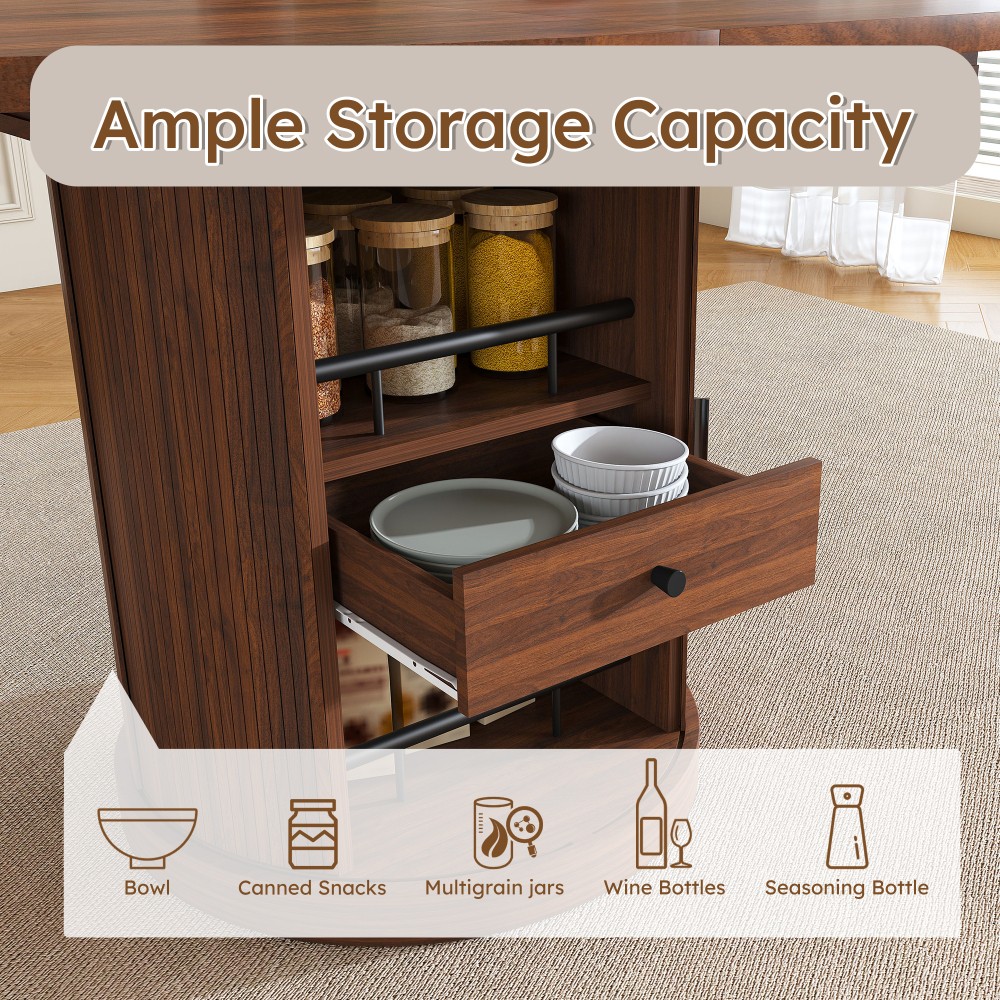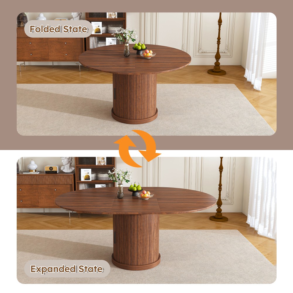 59" Extendable Oval Dining Table with 2-Tier Storage, Space Saving Expandable Kitchen Table - Walnut Brown MDF, Pedestal Base for Dining Room (Seats 4-6) Elevate your dining space with this versatile extendable oval dining table that blends boho charm with practical functionality! Crafted in a warm walnut brown finish, this table features an innovative space-saving design, 2-tier open storage, and a sturdy pedestal base—making it ideal for small apartments, open kitchens, and multi-purpose dining rooms. Seating 4 people comfortably in its compact form and expanding to accommodate 6 for gatherings, it’s the perfect balance of style, flexibility, and everyday practicality. Innovative Rail-Free Extendable Design (47" to 59") Say goodbye to clunky sliding rails! This oval dining table boasts a simplified yet robust rail-free extension mechanism that lets you manually expand the tabletop from 47" to 59" effortlessly. The tool-free, intuitive operation relies on hidden clasps and a pin-locking system to keep the table stable at every size—no wobbling or shifting, even when fully extended. Whether you’re enjoying daily family meals (4 seats) or hosting friends for a dinner party (6 seats), this table adapts to your needs seamlessly. 2-Tier Open Storage & Stylish Pedestal Base Maximize your dining space with built-in 2-tier open storage! The upper shelf is perfectly sized for napkins, condiments, or placemats—keeping everyday dining essentials within easy reach. The lower shelf is great for storing cookbooks, decorative items, or extra table linens, reducing clutter in your dining area. The classic pedestal base not only provides solid, balanced support for the table (even when extended) but also creates a visually cohesive look that merges functional design with boho-inspired elegance. Durable Walnut-Finish MDF Construction Built from high-density MDF with a scratch-resistant and heat-resistant walnut-grain laminated finish, this table delivers the warm, natural look of real wood without the high maintenance. The durable laminate coating stands up to daily wear and tear—from spills and scratches to hot dishes—ensuring long-lasting beauty. The reinforced pedestal base enhances structural integrity, making the table reliable for years of regular use in busy households. Safety-Focused Details for Peace of Mind Your family’s safety is a top priority! This dining table features rounded edges on the 2-tier storage shelves to prevent accidental bumps and scratches. The pedestal base is equipped with non-slip silicone feet that keep the table stable on any floor surface (hardwood, tile, or carpet) and protect your floors from scuffs. The simple lock-and-pin extension mechanism avoids complex moving parts, reducing the risk of malfunctions and making it safe for all users. Space-Adaptive & Multi-Functional for Any Home The soft oval shape eliminates sharp corners, creating a more inviting and family-friendly dining environment while saving valuable floor space. Designed for versatility, it works perfectly as a kitchen dining table, small space dining solution, or even a multi-purpose table in open-concept living areas. Use it in its compact 47" size for daily meals, then expand to 59" when hosting guests—intelligent engineering that maximizes space efficiency. Product Specifications Material: MDF (Medium-Density Fiberboard) with Walnut-Grain Laminated Finish Color: Walnut Brown Style: Boho Shape: Oval Assembly Type: Floor Mount Finish Type: Laminated Seating Capacity: 4 (Compact) - 6 (Extended) Extendable Size Range: 47.24" to 59.06" (Width) Assembled Dimensions: 59.06" (Length) x 47.24" (Width) x 29.53" (Height) Product Weight: 95.68 lbs Packaging Details Package Dimensions: 51.18" (Length) x 30.71" (Width) x 7.48" (Height) Package Weight: 106.26 lbs Shop With Confidence We stand behind the quality and durability of this extendable dining table! Enjoy a 1-Year Warranty for peace of mind against manufacturing defects, plus a 30-Day Free Return & Exchange Policy. If you’re not completely satisfied with your purchase, we offer a hassle-free return or exchange process—no hidden fees, just total satisfaction guaranteed.