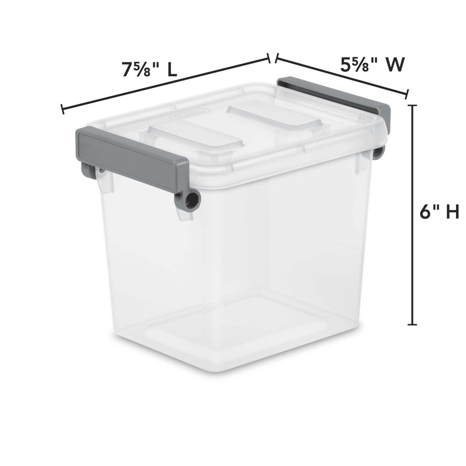 Sterilite's Modular Latch Boxes help make small storage organization easy! Available in a wide range of sizes and designed to stack and use vertical storage space efficiently. The color accented write-on latches keep the covers secured to the base while providing a space for labeling, making personalization simple! Label by contents, activity, or by name, use a dry-erase marker to erase and re-label as necessary or apply a standard adhesive label. Use the 2.5 Qt size for organizing closets, craft areas, play rooms, office spaces, bathrooms, workshops and more! Keep health and beauty items, accessories, and craft supplies, neat and contained, where they are most frequently used. Its clear base and lid allow items to be viewed from any angle. The 1.2 Qt and 2.5 Qt have the same size lid, allowing shallow and deep containers to stack in the same footprint. The overall assembled dimensions of this item are 7 5/8" L x 5 5/8" W x 6" H. Sterilite Adult Plastic 2.5 Qt. Modular Latch Box Titanium: Outside Dimensions: 7 5/8" x 5 5/8" x 6" Use the 2.5 Qt size for organizing your living spaces - store health and beauty items, accessories, craft supplies, and more Single unit option Clear base and lid allows contents to be viewed at a glance, making them easy to find - Titanium Interior Dimensions at bottom: 5 3/8" x 4 3/8" x 5 3/8" Write-on ID Latches make personalizing storage easy Ideal for a variety of small storage needs Dry-erase markers easily erase if relabeling is needed Stack for efficient use of vertical storage space BPA-free and phthalate-free