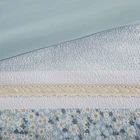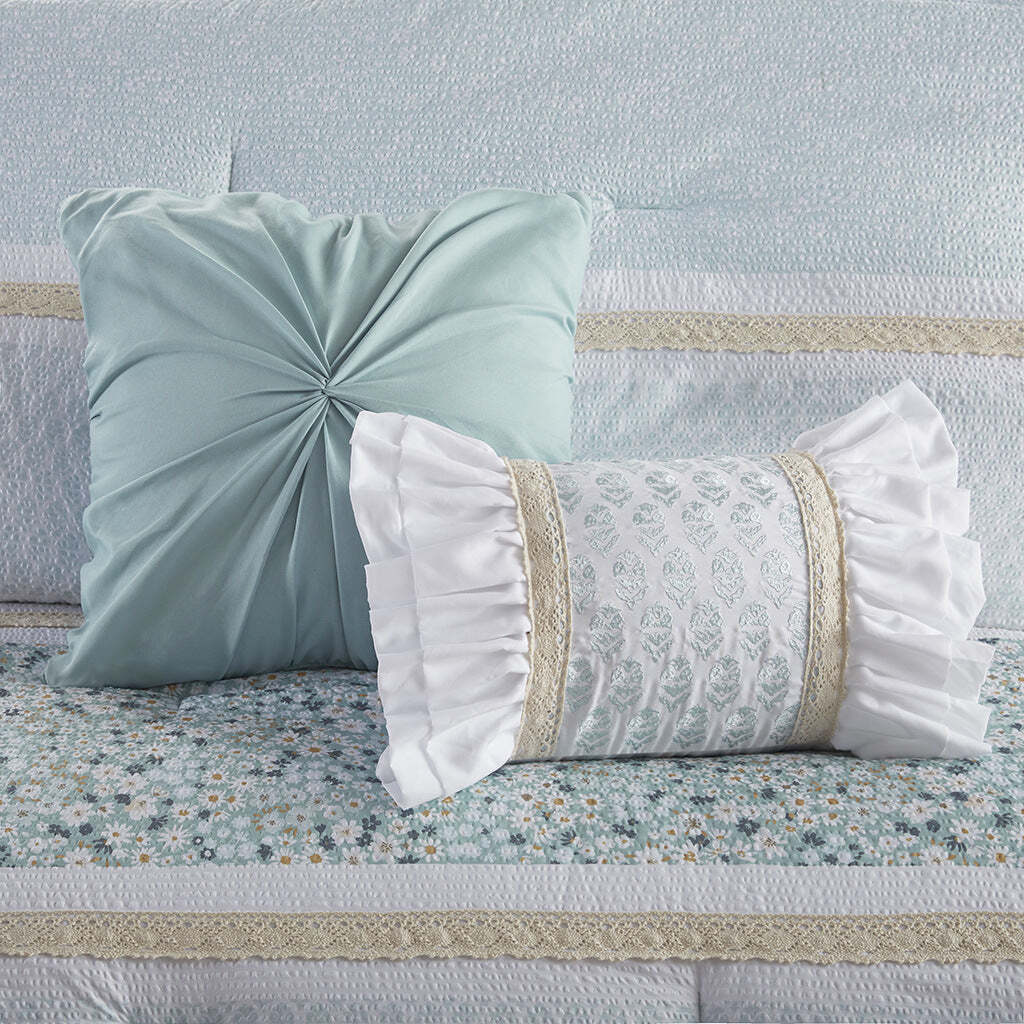 Specification Main Color:Aqua Main Material:Polyester Details Product Features: Set includes comforter, 2 matching shams and 2 throw pillows Printed seersucker microfiber polyester; 100% polyester comforter and pillow filling Shabby Chic/Farmhouse style featuring three floral/botanical print design separated by lace embellishment Throw pillows featuring gathered fabric and embroidery with lace trim and ruffles Machine washable and spot clean fabric (See care label) Items may come in compressed packaging to ensure efficient shipping Items will need to be fluffed up and steam ironed if compressed Hypoallergenic polyester filling in the comforter and pillow (filling contains no allergens and is treated to be dustproof) Antimicrobial treatment to keep the bedding/linen fresher for longer by inhibiting bacteria growth Description: Description Featuring three different floral and botanical print designs separated by lace trims, this seersucker microfiber comforter set exudes shabby chic/farmhouse style that adds a touch of elegance to any bedroom. The two decorative pillows feature gathered fabric and embroidery with lace trim and ruffles, adding to the overall charm of the set. Colors featured in this set include various shade of aqua, blue, green, yellows, and whites. The comforter and pillows are filled with hypoallergenic polyester filling that is treated to be dustproof, ensuring a restful and comfortable sleeping experience. This machine washable bedding set features an antimicrobial treatment, which inhibits bacteria growth and keeps the bedding fresher for longer. Product Details King/Cal King1 Comforter:104"W x 92"L2 King Shams:20"W x 36"L (2)1 Throw Pillow:12"W x 18"L1 Throw Pillow:18"W x 18"L Material Comforter/Sham: Seersucker microfiber with lace, printed; solid microfiber, 100% polyester reverseFill: 100% polyesterPillow: 100% polyester Listing and template services provided by inkFrog