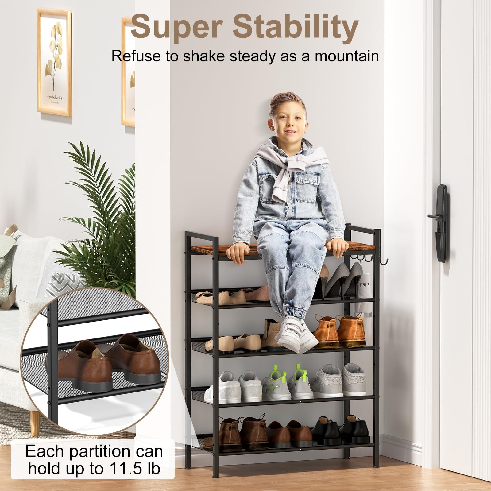 Shoe Rack for Front Door Entrance, 5 Tier Height-Adjustable Metal Shoe Rack , Sturdy Wooden Top and Tiltable Steel Frame Heavy Duty Shoe Organizer for Bathroom,Bedroom,Kitchen,Include Hook Organize Your Shoes: 5-Tier shoe rack, each shelf can hold 3-5 pairs of shoes, a total of 15-25 pairs of shoes to ensure your shoes are neatly arranged, the distance between the 4 mesh shelves is 8 inches to accommodate high heels and boots on the shelf. This shoe rack for entryway maximizes space utilization and simplifies organization, maintaining a tidy environment for you Adjustable Height and Tilt: The dimensions of the 5 tier shoe rack are: 29.1" wide * 11.8" deep * 38.7" high. The basic distance between each layer of the shoe rack is 8 inches. You can also adjust the height through the round holes on the side of the shoe shelf to meet your height requirements. At the same time, our shoe rack also supports angle tilt to adapt to your placement habits, making shoe storage easier and more convenient Strong Load-bearing Capacity: This metal shoe rack is made of high quality wood and metal mesh, the material is solid and textured, and has excellent corrosion resistance.Heavy duty shoe rack, to ensure that each layer can withstand a large weight and not easy to deformation, the top of the board smooth and thick can even carry the weight of a child, refusing to slack easy to fall apart of the ordinary wooden shoe rack Upgraded Design: This shoe organizer cabinet is equipped with a row of hooks, providing you with extra storage space for hanging umbrellas, keys, headphones, bags, hats, shopping bags, rackets, etc.; in addition, we increased the height of each compartment during production, which is more suitable for most types of shoes. The mesh surface of the compartment is also upgraded and encrypted to avoid the problem of high heels getting stuck. This shoe organizer provides additional thoughtful design to help maximize the use of limited space to meet your daily storage needs Easy installation: The shoe rack has a simple structure, is strong and durable, and is easy to disassemble and assemble. The number of layers of the shoe rack can be changed according to the size of the external space. It is practical and easy to use. The independent shoe rack is packaged with parts with clear instructions and labels. You only need to assemble it according to the instructions, and you can quickly get a complete shoe rack cabinet in 10 minutes Multi-purpose storage rack: This shoe rack is compact and takes up little space, making it an ideal storage rack for small spaces, perfect for the front door entrance or other corners. This shoe rack is not only suitable for shoes, but can also be placed in the bathroom, room, living room to store toiletries, paper towels, bags, towels, hats, books, storage boxes, potted plants, vegetables, kitchen tools, etc. The minimalist matte black frame is smooth and sturdy, and the retro brown surface is noble and exquisite, making this shoe rack a perfect match with your home decor